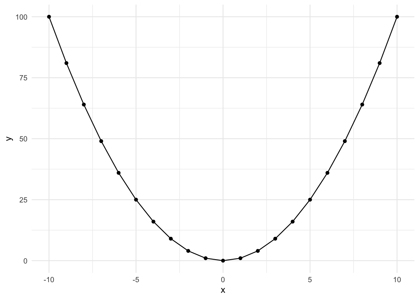 Here’s what a \(y = x^2\) looks like when plotted over the range -10 to 10. It’s u-shaped and can be flipped depending on the sign.
