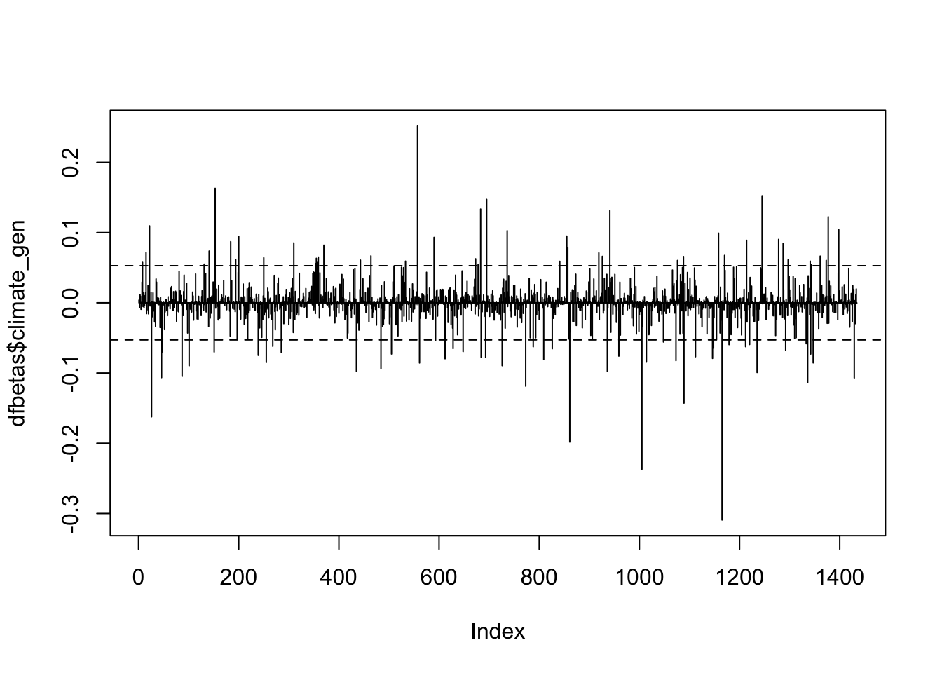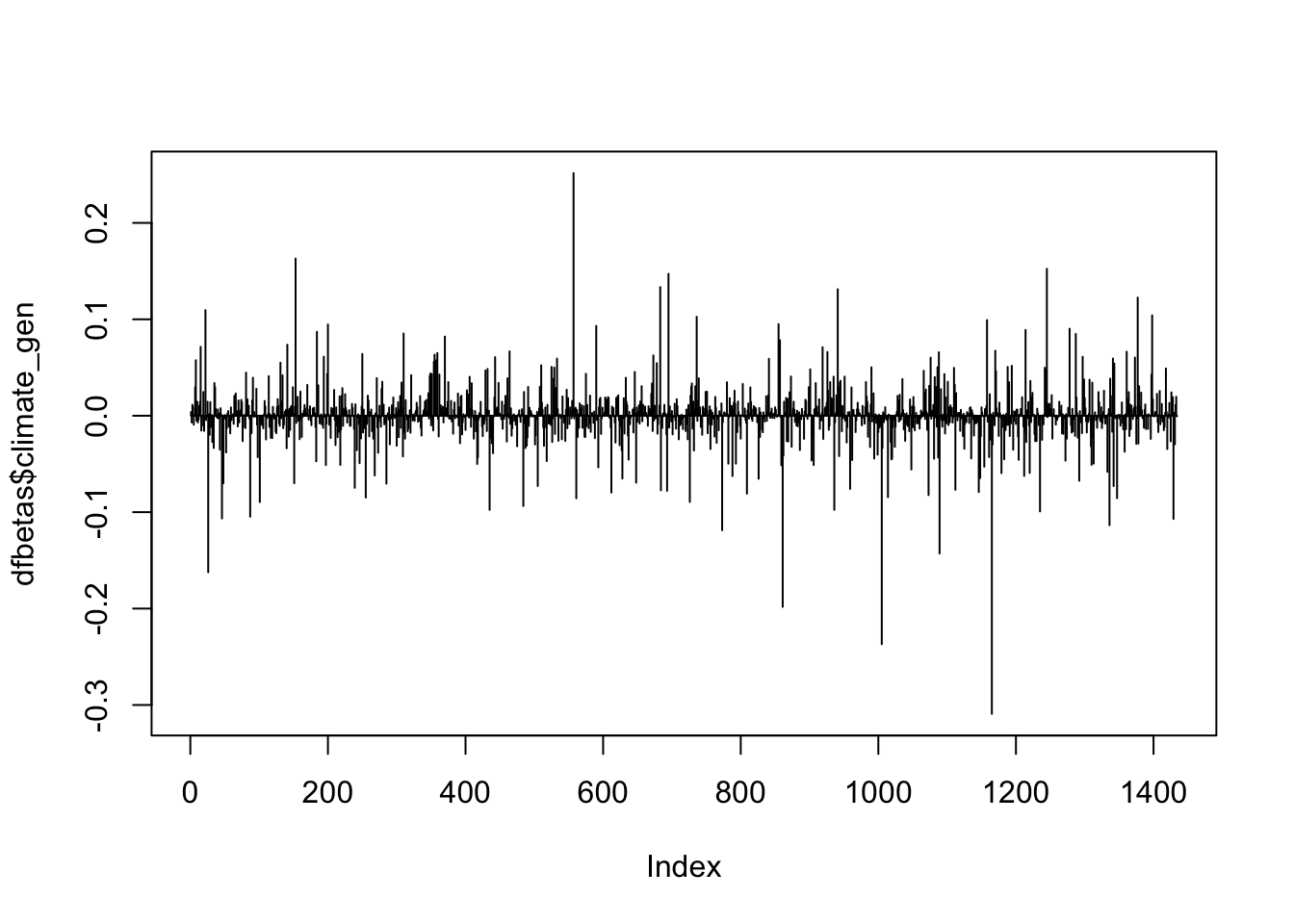 head(dfbetas)| (Intercept) | climate_gen | climate_dei | undergrad | female | race_5Black | race_5Hispanic/Latino | race_5Other | race_5White |