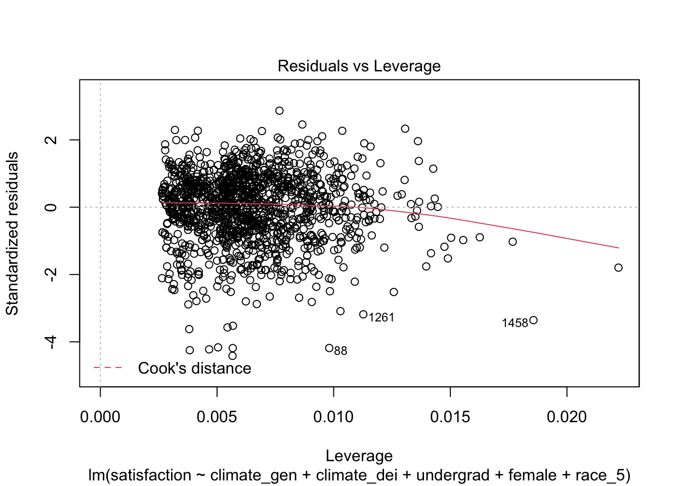 fit1 <- lm(satisfaction ~ climate_gen + climate_dei + undergrad + female +