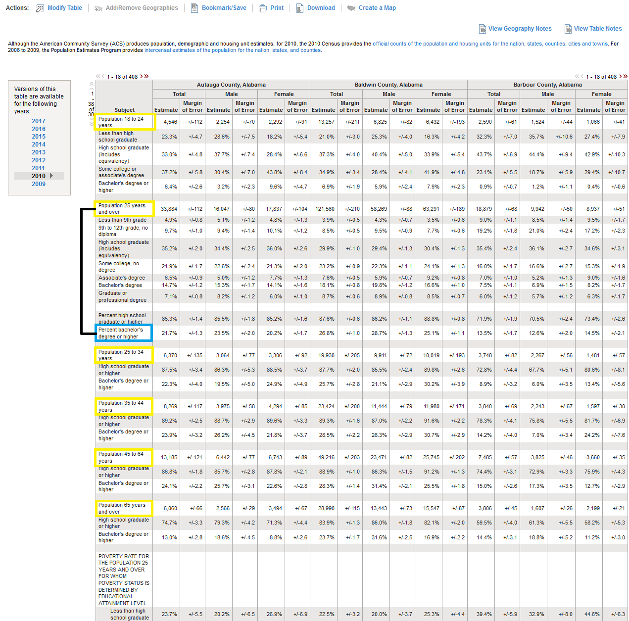 U.S. Census Bureau. 2010. 2006-2010 American Community Survey. https://factfinder.census.gov/faces/tableservices/jsf/pages/productview.xhtml?pid=ACS_10_5YR_S1501&prodType=table.