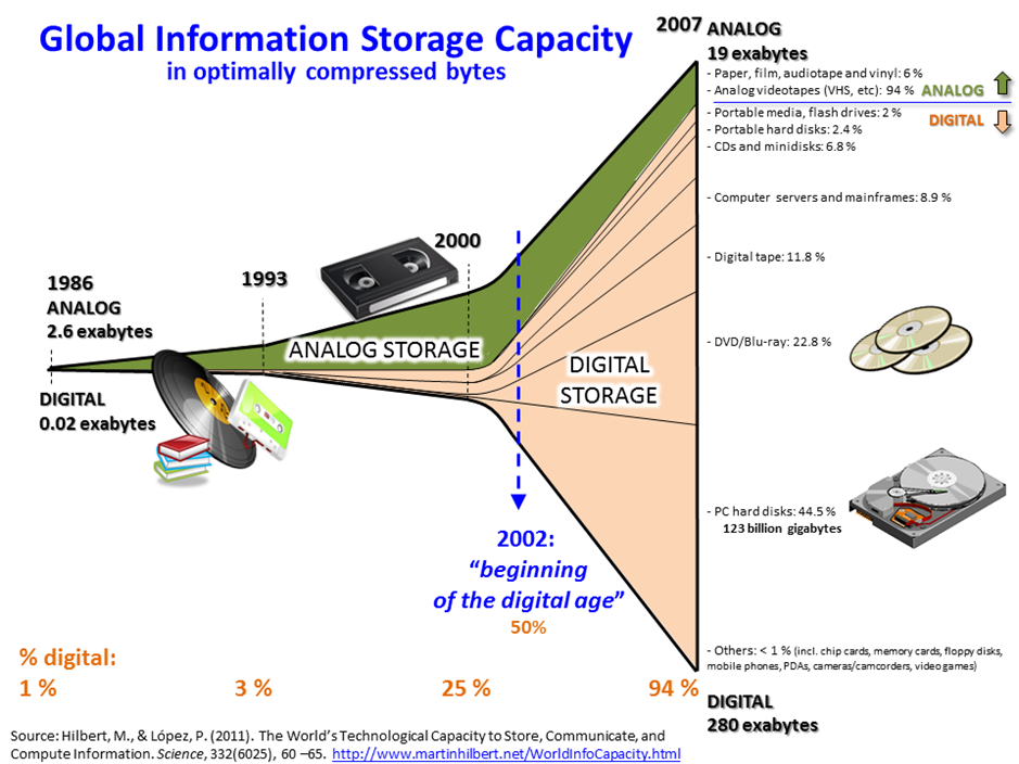 为什么会有data science?大家应该能直观地感受到:随着个人电脑的普及,互联网越来越发达,整个社会所产生的数据呈现爆炸式的增长。下图是一个可视化的例子。我们可以看到,在计算机出现之前人类产生的数据是非常少的,而计算机出现之后产生的数据越来越多。