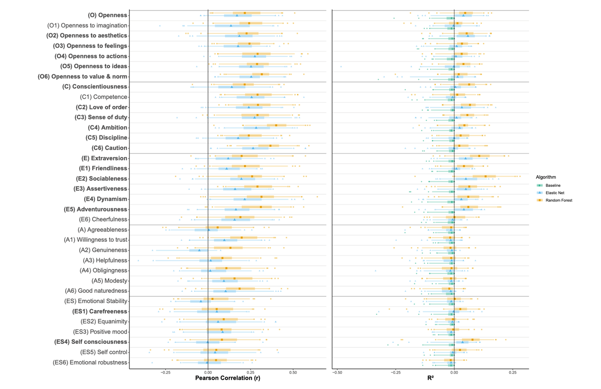 这里有几个例子。比如这个是利用手机里的数据预测人格,我们这里看到的纵轴就是人格的类型,不同的颜色表示使用不同的方法进行预测,横轴是相关系数。可以发现说手机里的一些数据和人格的倾向是密切相关的。
