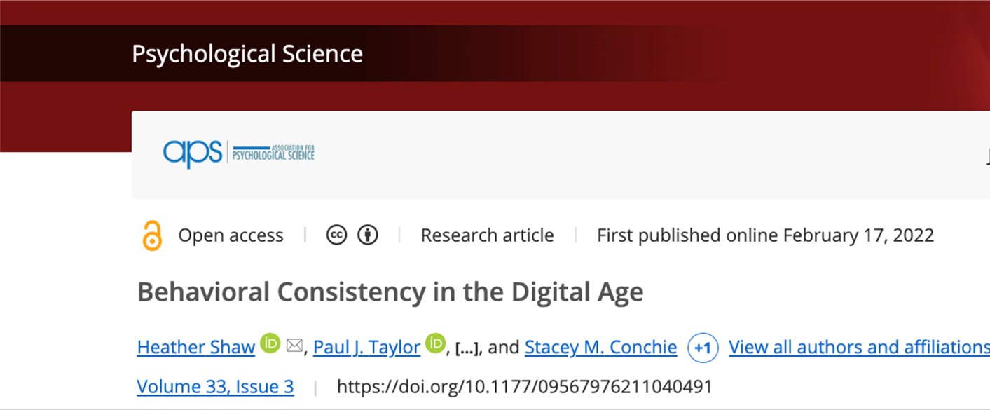 另外,像我们心理学的顶刊Psychological Science,上面也不定期的有研究是探索我们在数字的视觉中留下的痕迹跟我们的行为之间的关系。比如这篇文章发现我们个体在使用手机的行为上是非常的一致的。研究者通过大量的数据是得到了一个比较强的一个结论,尽管这个结论比较简单,但是基于数据量比较大,说服力是比较强的。