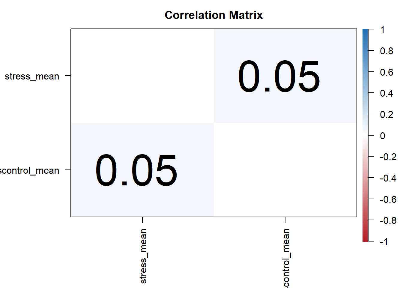 运行完了之后它会自动的输出一个图 我们可以看到就是stress_mean和control_mean,它自动会以一个矩阵的形式来输出一个相关矩阵 然后我们可以看到这里有一个从-1到1的一个 legend图例,颜色越浅的话表示相关越低,它应该会把显著的相关会标出来,如果没有记错的话,这个地方可以看到它这里显示的数字 就是它的相关系数0.05,这是一个相当小的一个相关系数。 我们其实也可以把它输出为一个word文档,需要注意的是我们可能需要精确的指出我们以哪些columns作为输入 假如说大家不选择的话,它会把性别和我们的别的变量也做相关,与其他的两个连续变量也会做相关。但这样的情况是不能用pearson的。 假如说们有一个变量是男性和女性,另外一个变量是连续的变量,我们不能直接用pearson做相关,我们应该用点二类相关,或者直接使用t检验。