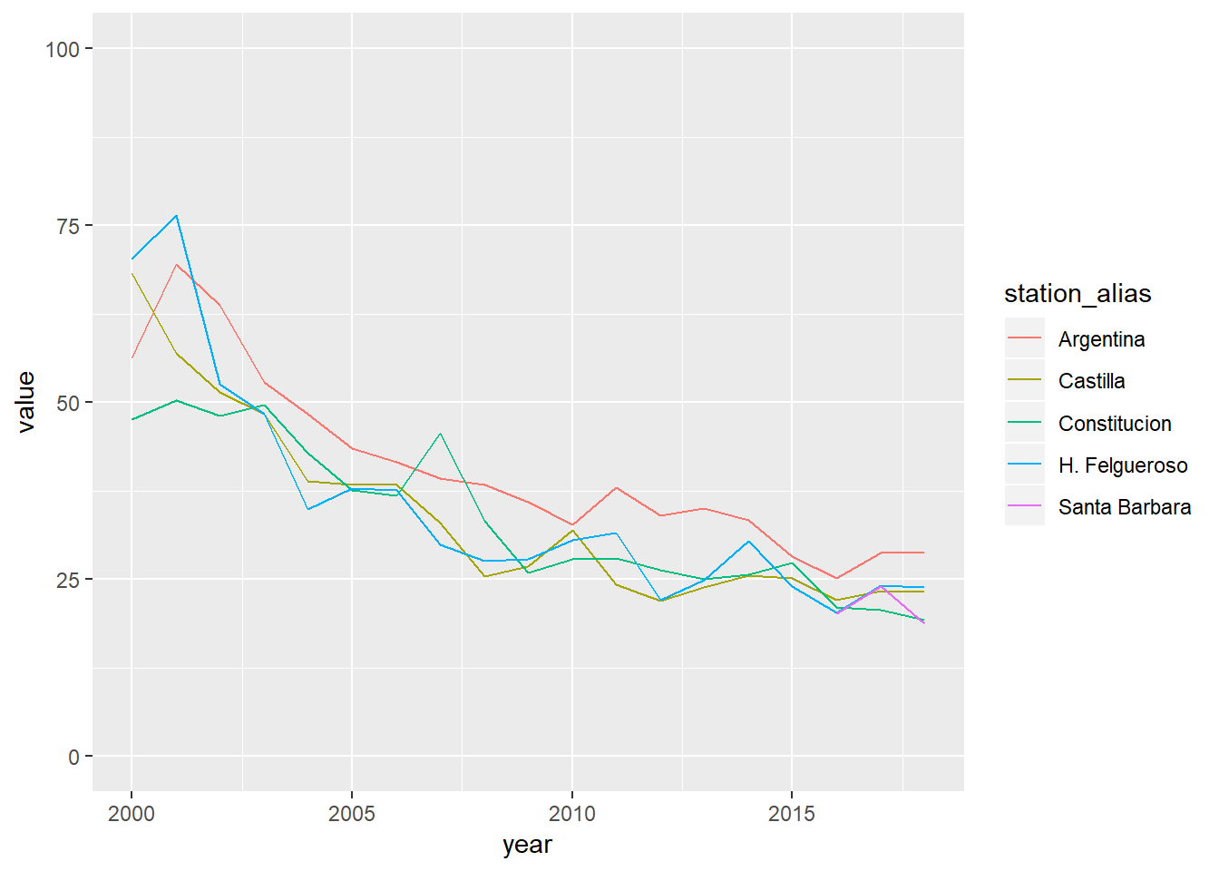 ggplot(year_avgs_long_pm10, aes(x = year, y = value, group = station_alias, color = station_alias)) +