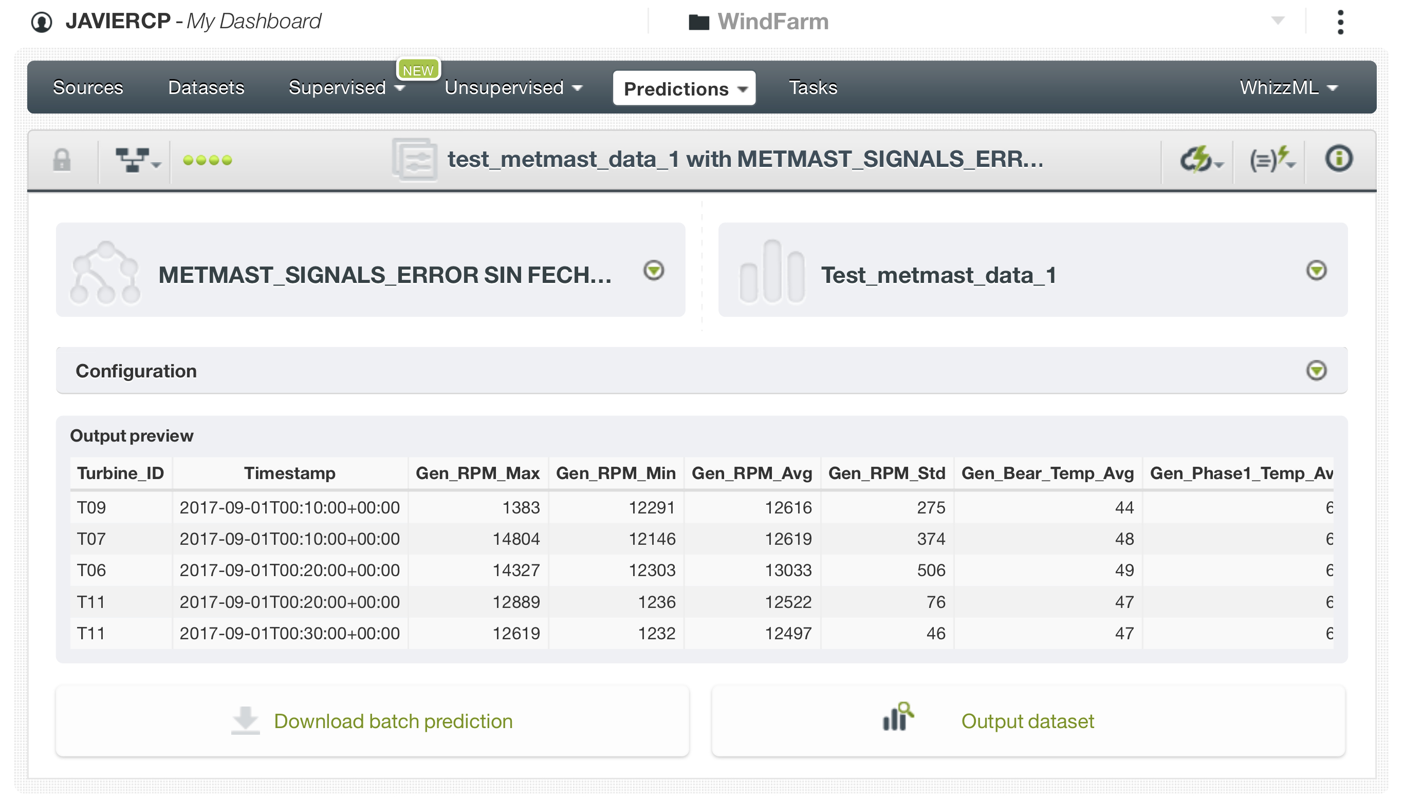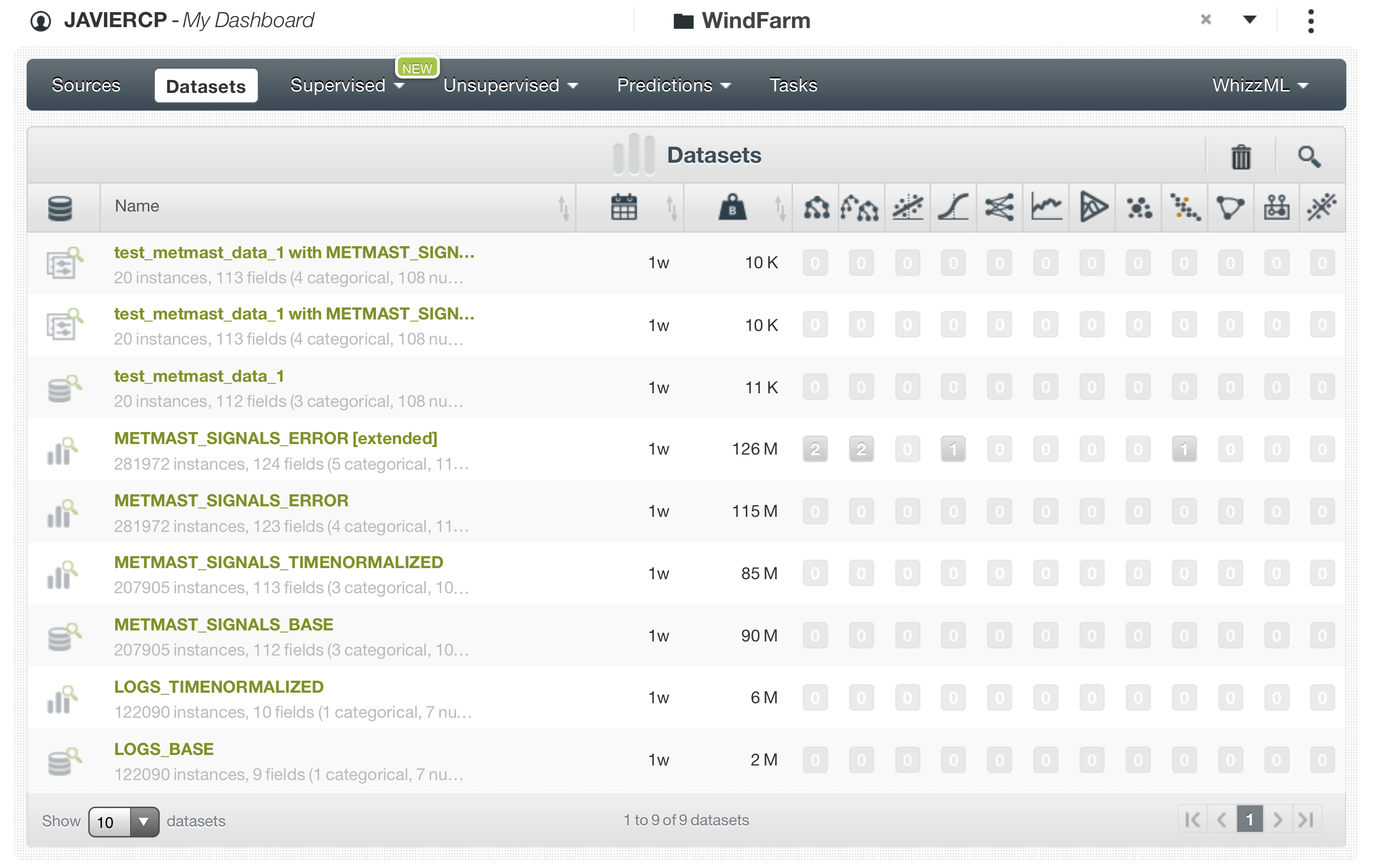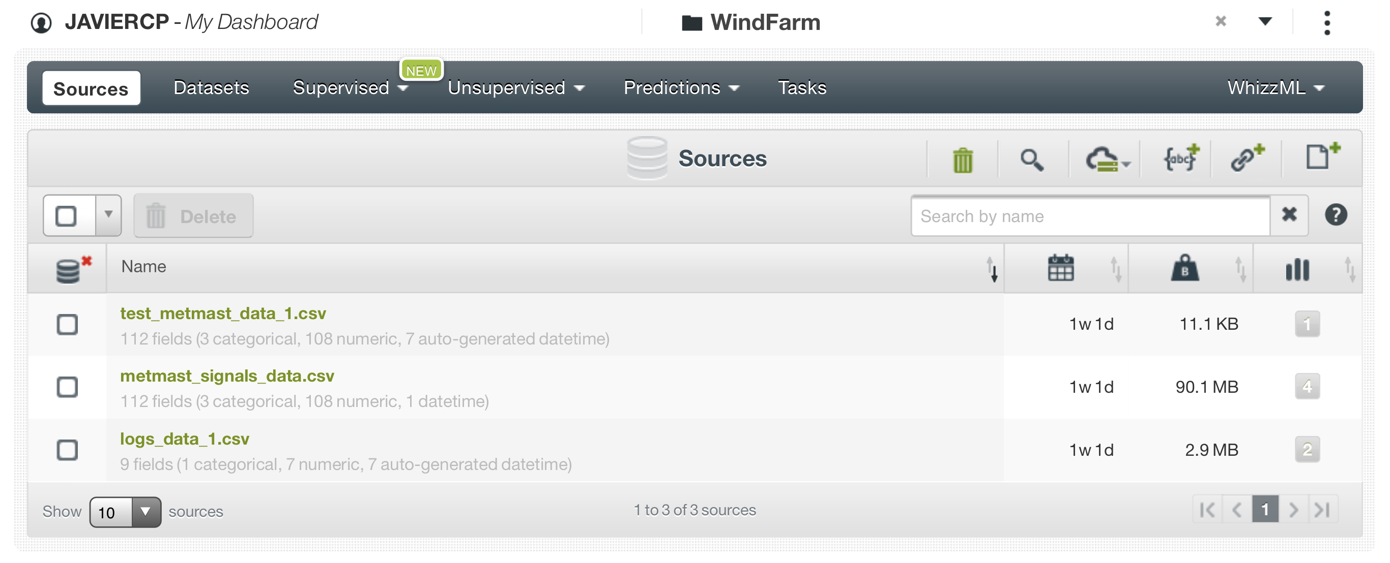 Aquí se ven las fuente de datos creadas para este reto. “logs_data_1.csv” es la fuente a partir de los errores de las torres. “metmast_signals_data.csv” es la fuente a partir de los datos de las condiciones meteorológicas y los datos de los sensores SCADA (procesadas en R para hacer el join). Y “test_metmast_data_1.csv” es la fuente con los datos de test para hacer las predicciones.