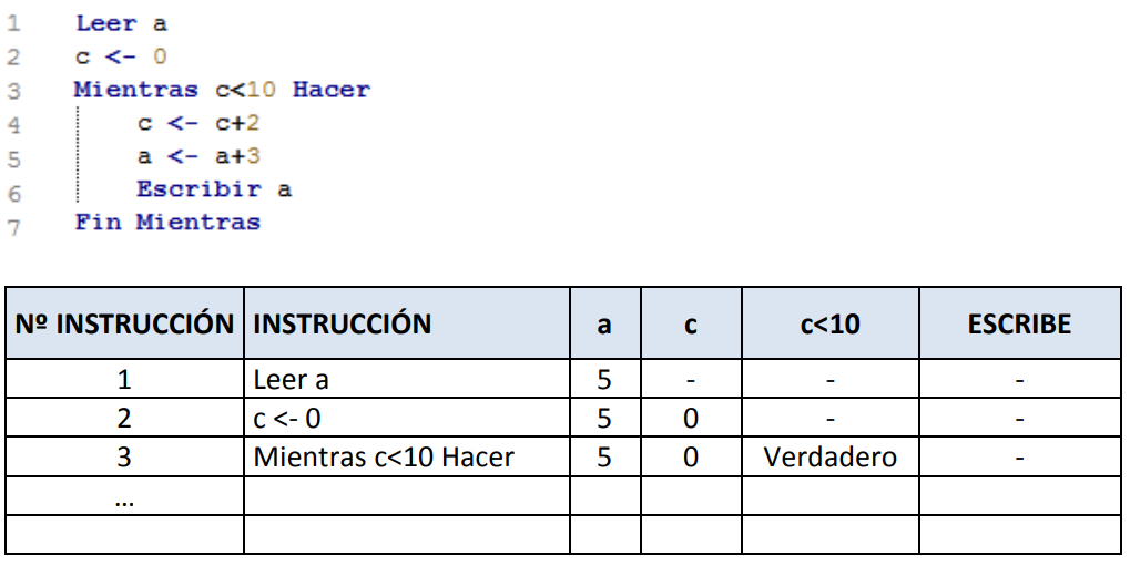 12.- Para realizar la traza se ha de hacer un seguimiento de los valores que toman las variables simulando manualmente la ejecución del algoritmo, es decir, siguiendo el flujo de ejecución del mismo. Haz la traza del siguiente programa e indica qué valores toman las variables y qué escribe, suponiendo que a “a” se le da el valor 5. Continúa rellenando la tabla.