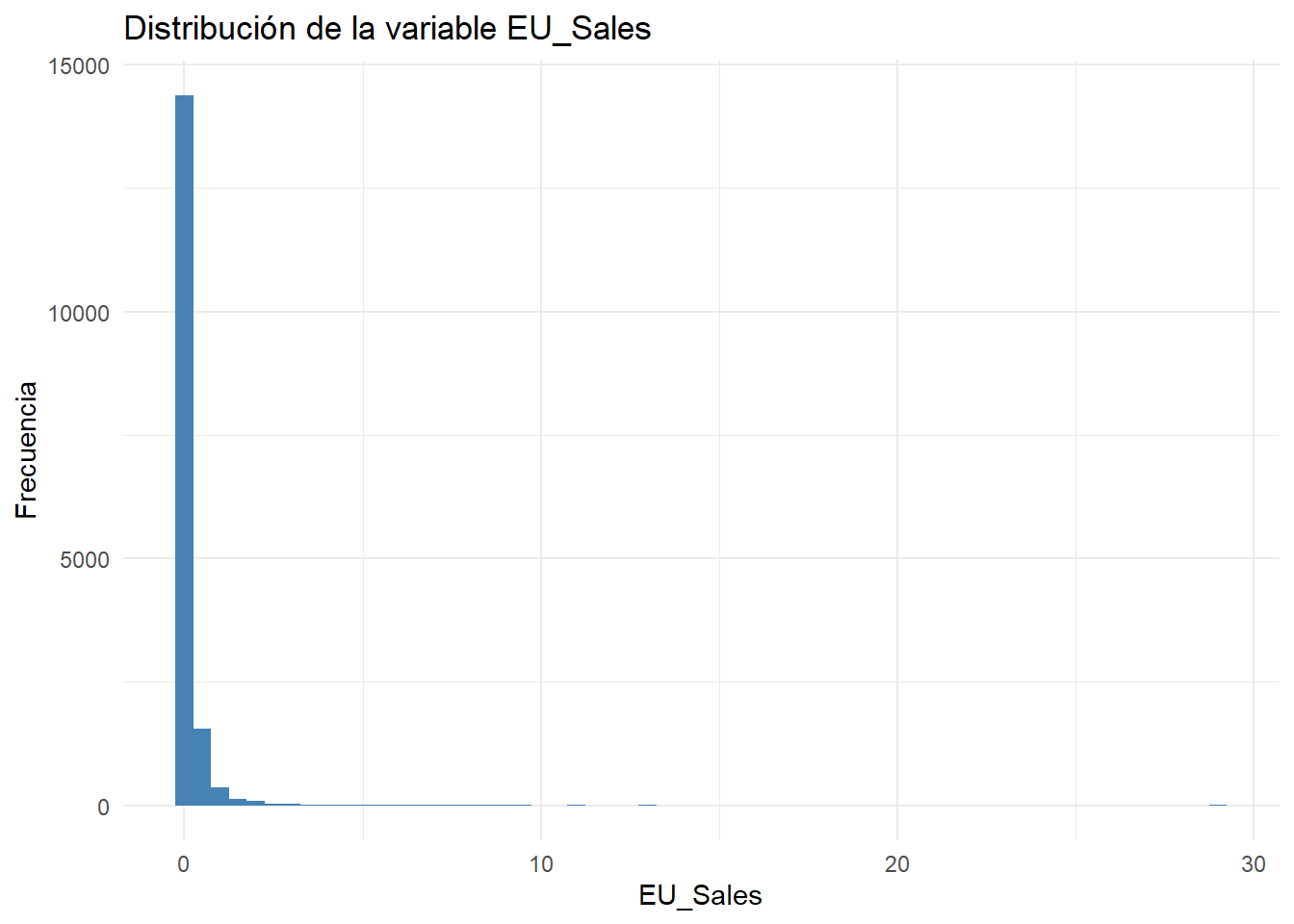 “ggplot(df) + geom_histogram(binwidth = 0.1, aes(x = ), fill = ‘steelblue’) + xlab(”“) + ylab(”Frecuencia”) + ggtitle(“Distribución de la variable x”) + theme_minimal()”