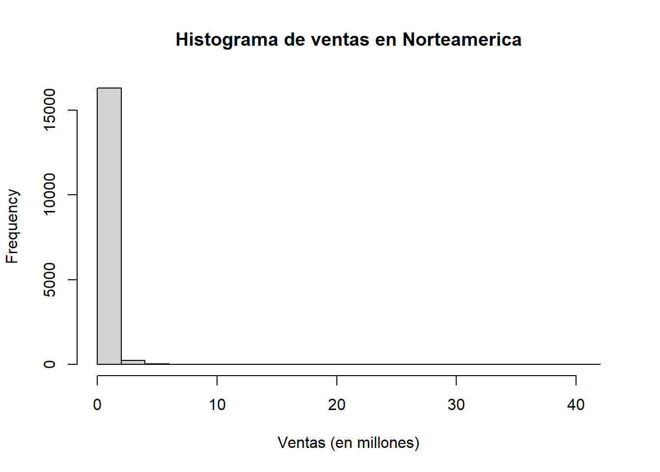 hist(datos$NA_Sales, main = "Histograma de ventas en Norteamerica", xlab = "Ventas (en millones)")