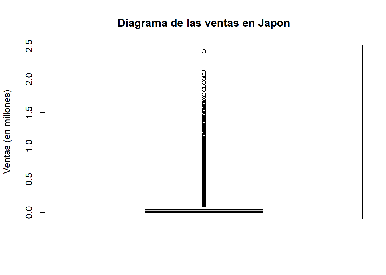 boxplot(datos$JP_Sales_log, main = "Diagrama de las ventas en Japon", ylab = "Ventas (en millones)")