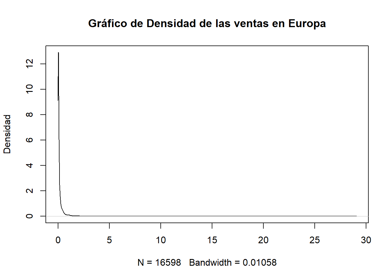 plot(density(datos$EU_Sales), main = "Gráfico de Densidad de las ventas en Europa", ylab = "Densidad")