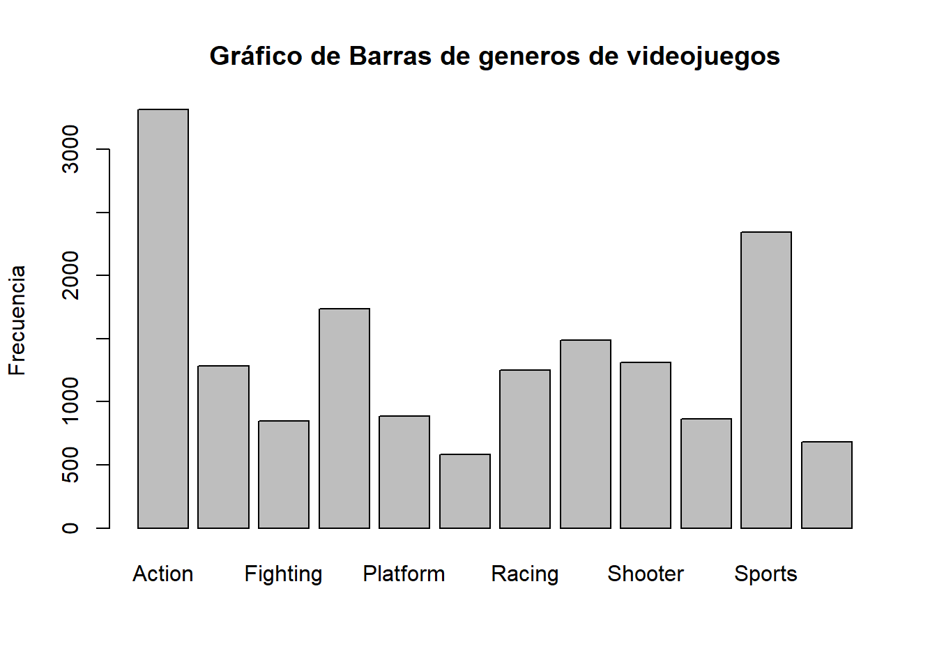 barplot(table(datos$Genre), main = "Gráfico de Barras de generos de videojuegos", ylab = "Frecuencia")