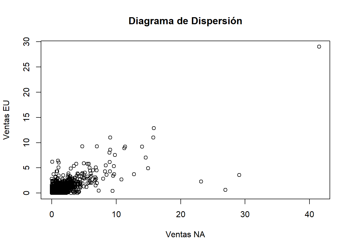 plot(datos$NA_Sales, datos$EU_Sales, main = "Diagrama de Dispersión", xlab = "Ventas NA", ylab = "Ventas EU")