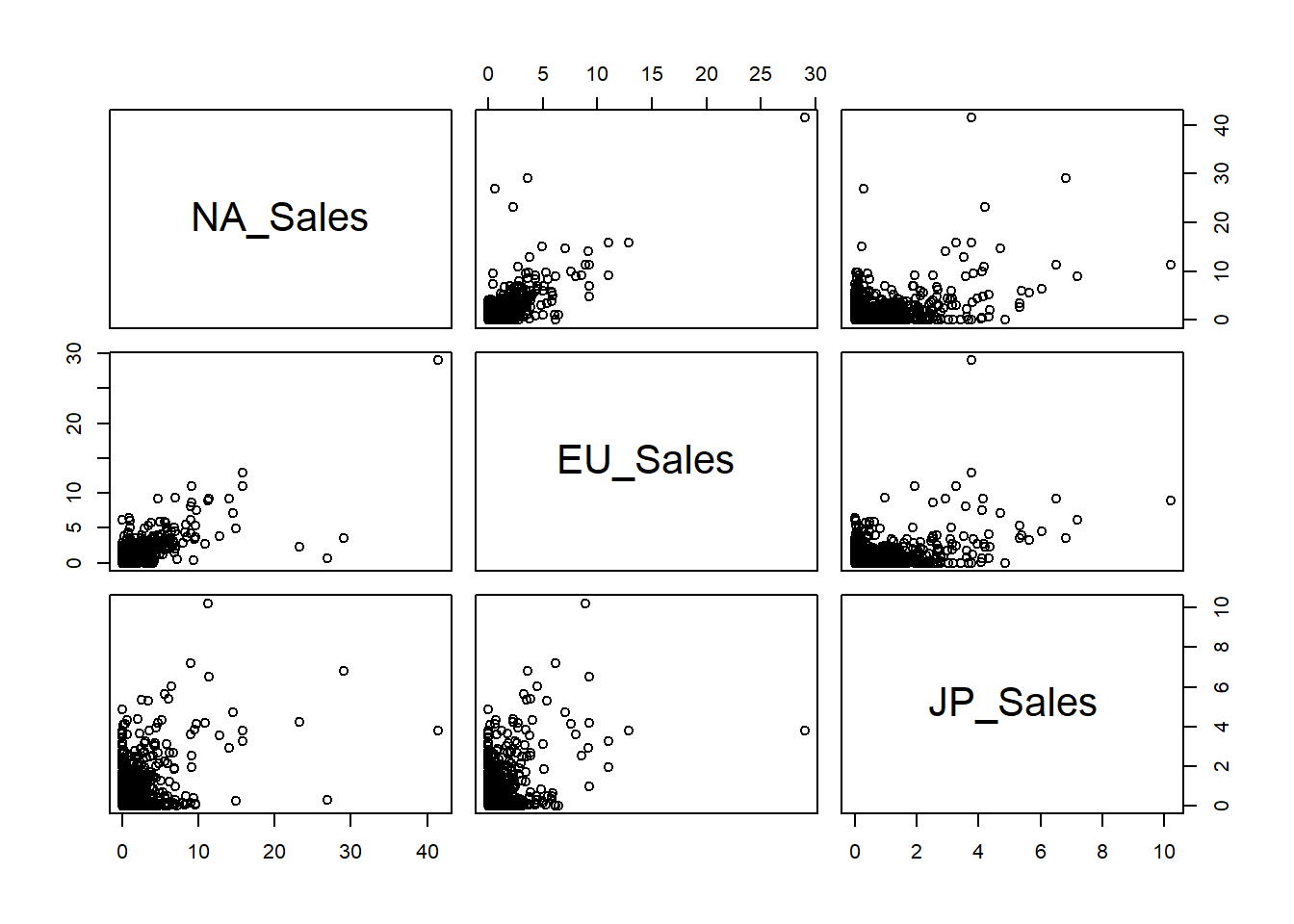 pairs(datos[, c("NA_Sales", "EU_Sales", "JP_Sales")])