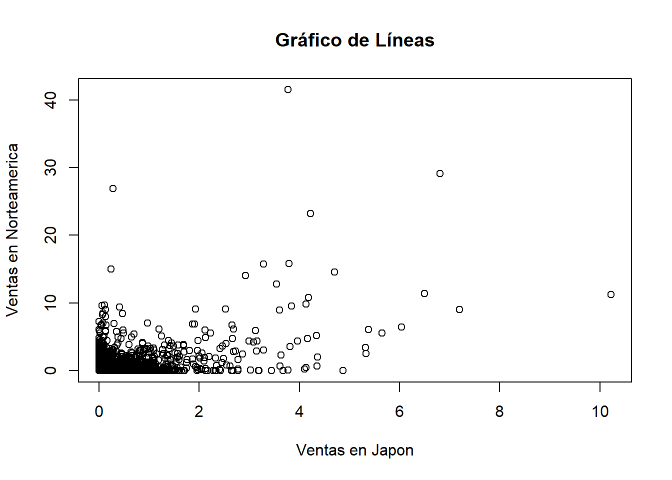 plot(datos$NA_Sales ~ datos$JP_Sales, main = "Gráfico de Líneas", xlab = "Ventas en Japon", ylab = "Ventas en Norteamerica")