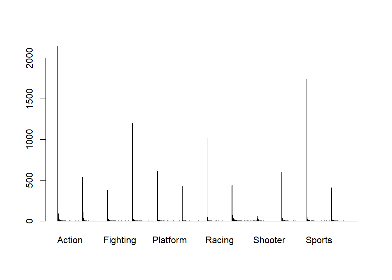 barplot(table(datos$JP_Sales, datos$Genre), beside = TRUE)