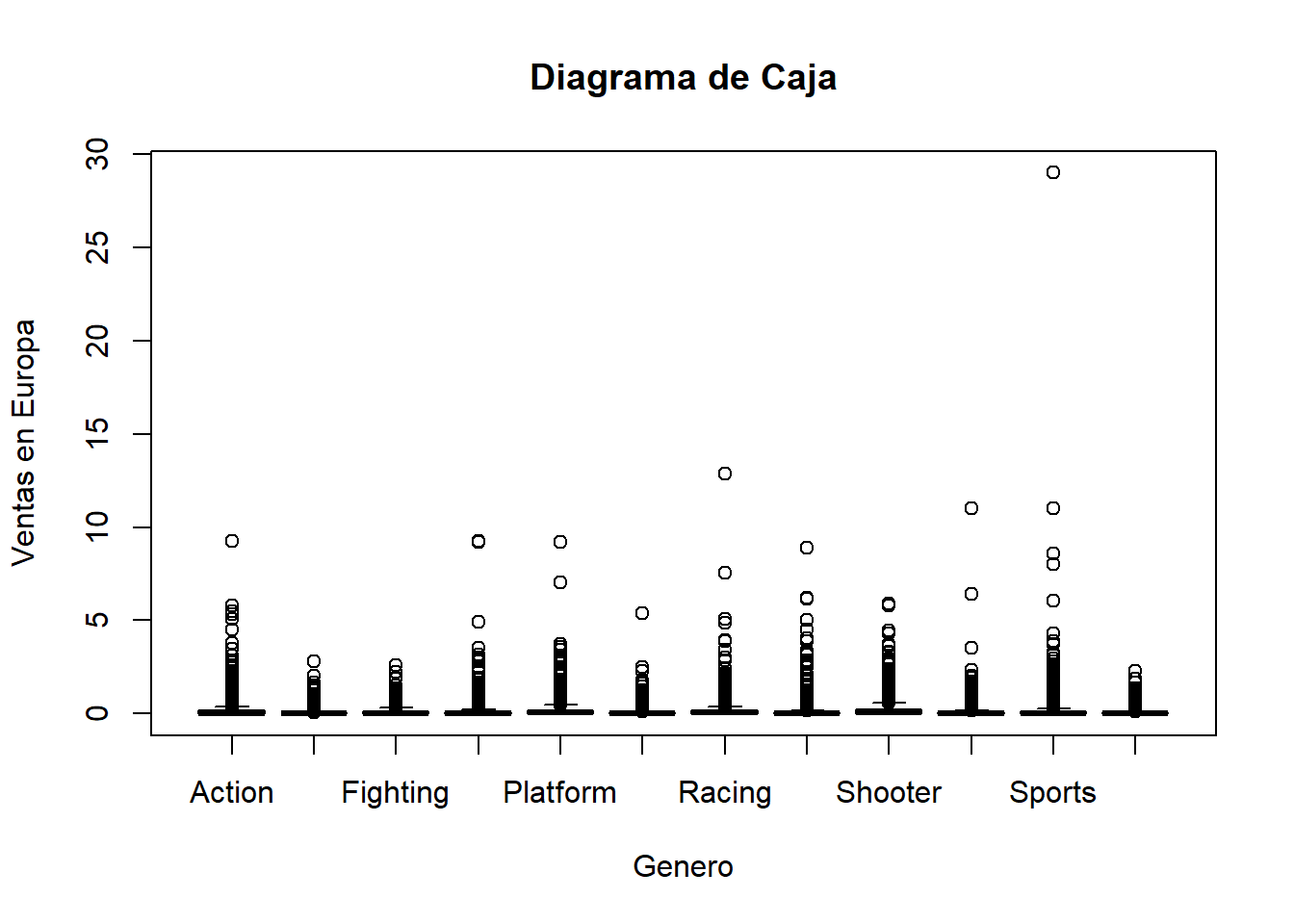 boxplot(datos$EU_Sales ~ datos$Genre, main = "Diagrama de Caja", xlab = "Genero", ylab = "Ventas en Europa")