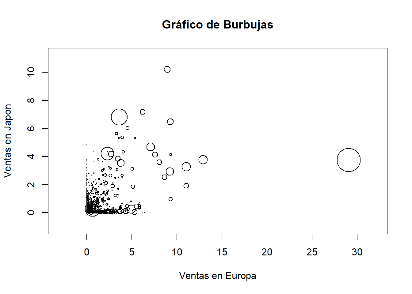 symbols(datos$EU_Sales, datos$JP_Sales, circles = datos$NA_Sales, inches = 0.2, main = "Gráfico de Burbujas", xlab = "Ventas en Europa", ylab = "Ventas en Japon")
