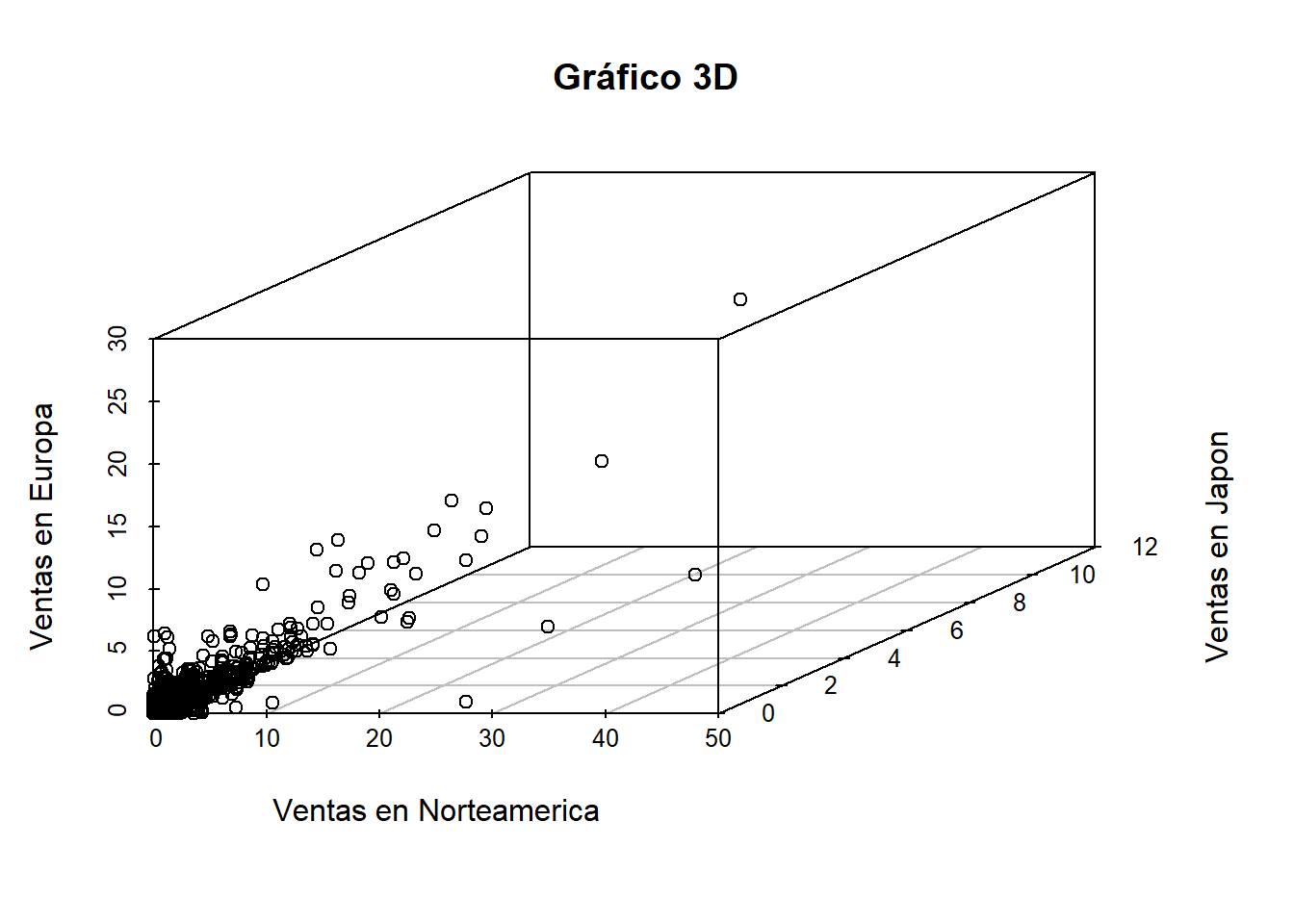 scatterplot3d(datos$NA_Sales, datos$JP_Sales, datos$EU_Sales, main = "Gráfico 3D", xlab = "Ventas en Norteamerica", ylab = "Ventas en Japon", zlab = "Ventas en Europa")