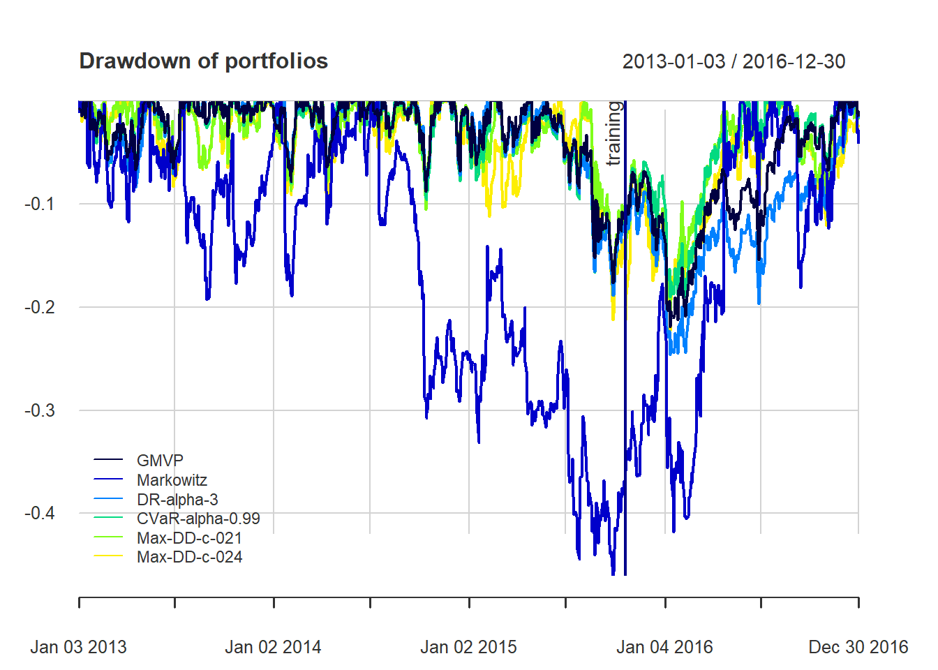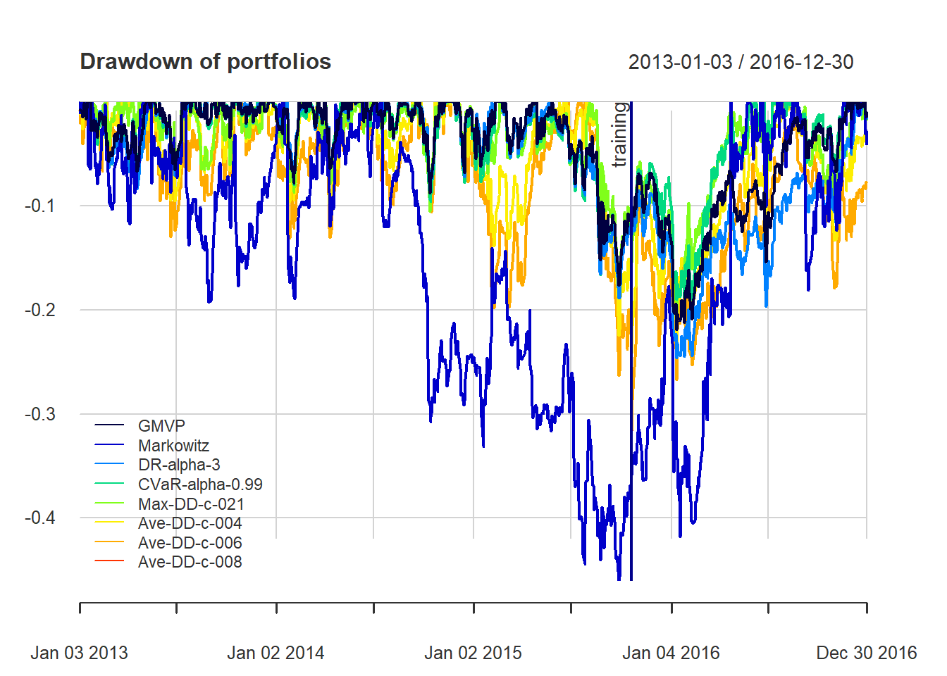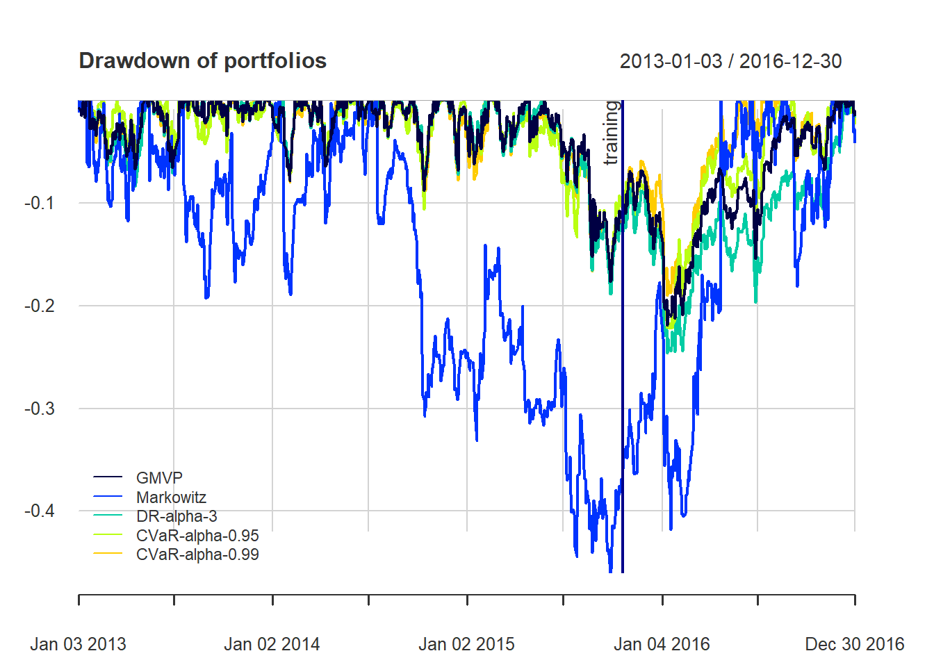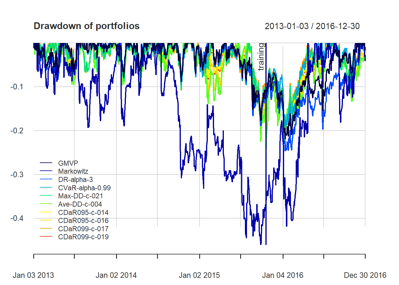 As a note of caution, one has to be careful with CVaR and CDaR portfolios due to the sensitivity to the used data (if not enough data, they will not be reliable).