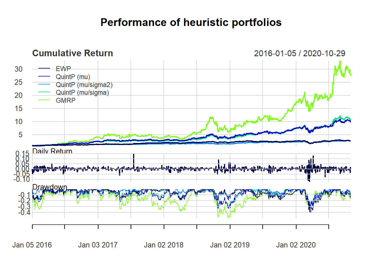 charts.PerformanceSummary(ret_heuristic, main = "Performance of heuristic portfolios", wealth.index = TRUE, colorset = rich8equal)