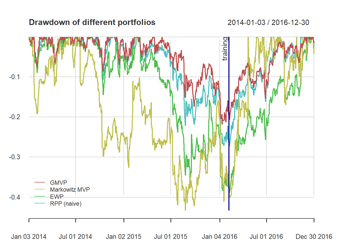 { chart.Drawdown(ret_all, main = "Drawdown of different portfolios",