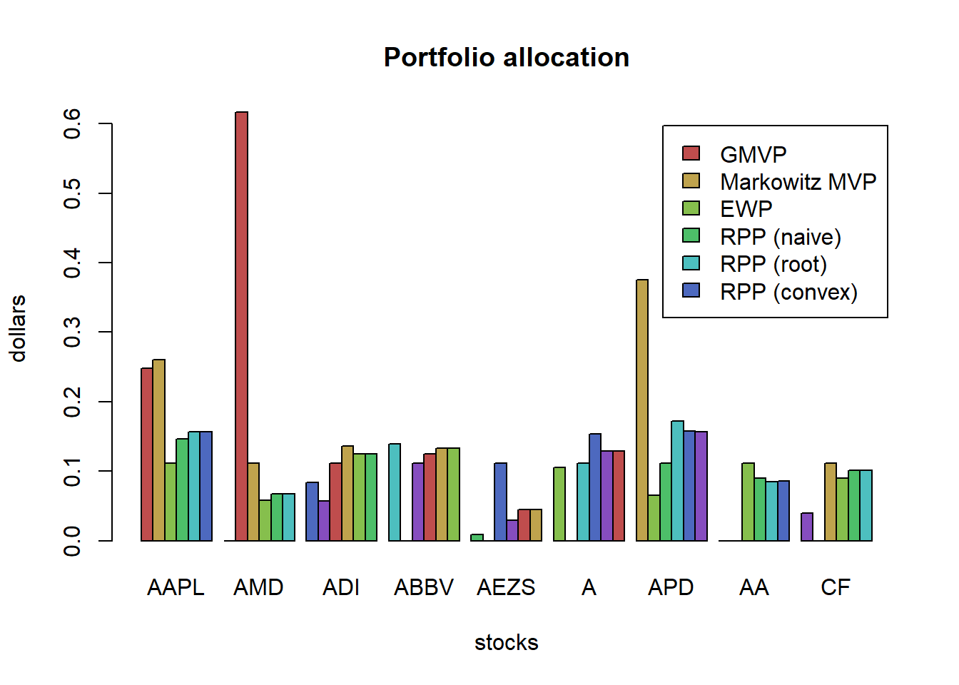 main = "Robust (box) GMVP allocation", xlab = "stocks", ylab = "dollars")