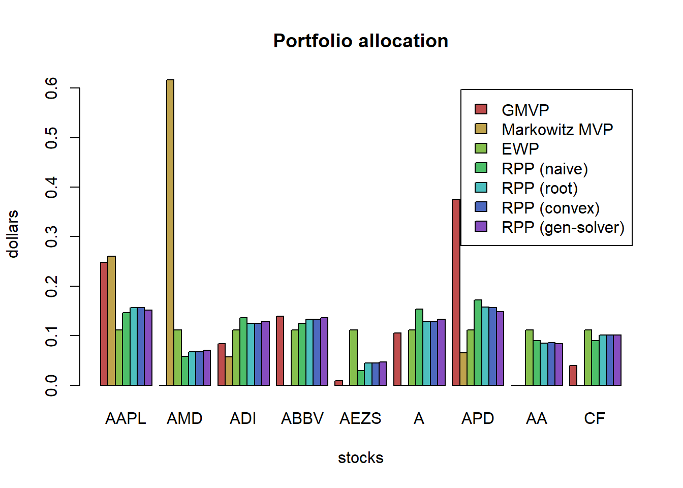barplot(t(w_all_Markowitz), col = rainbow8equal[1], legend = colnames(w_all_Markowitz), beside = TRUE, main = "Markowitz portfolio allocation", xlab = "stocks", ylab = "dollars")