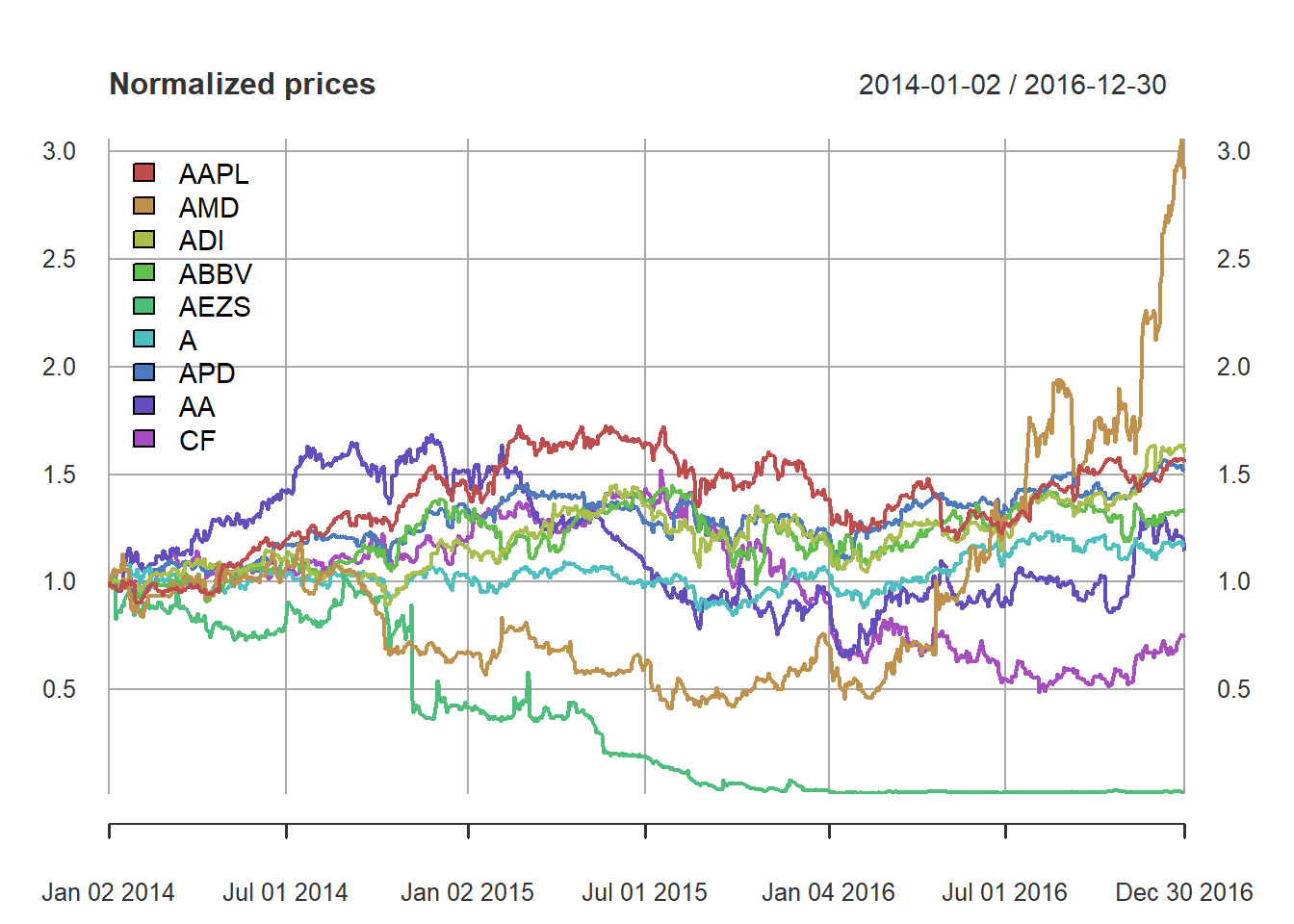 tickers <- c("AAPL", "AMD", "ADI", "ABBV", "AEZS", "A", "APD", "AA","CF")