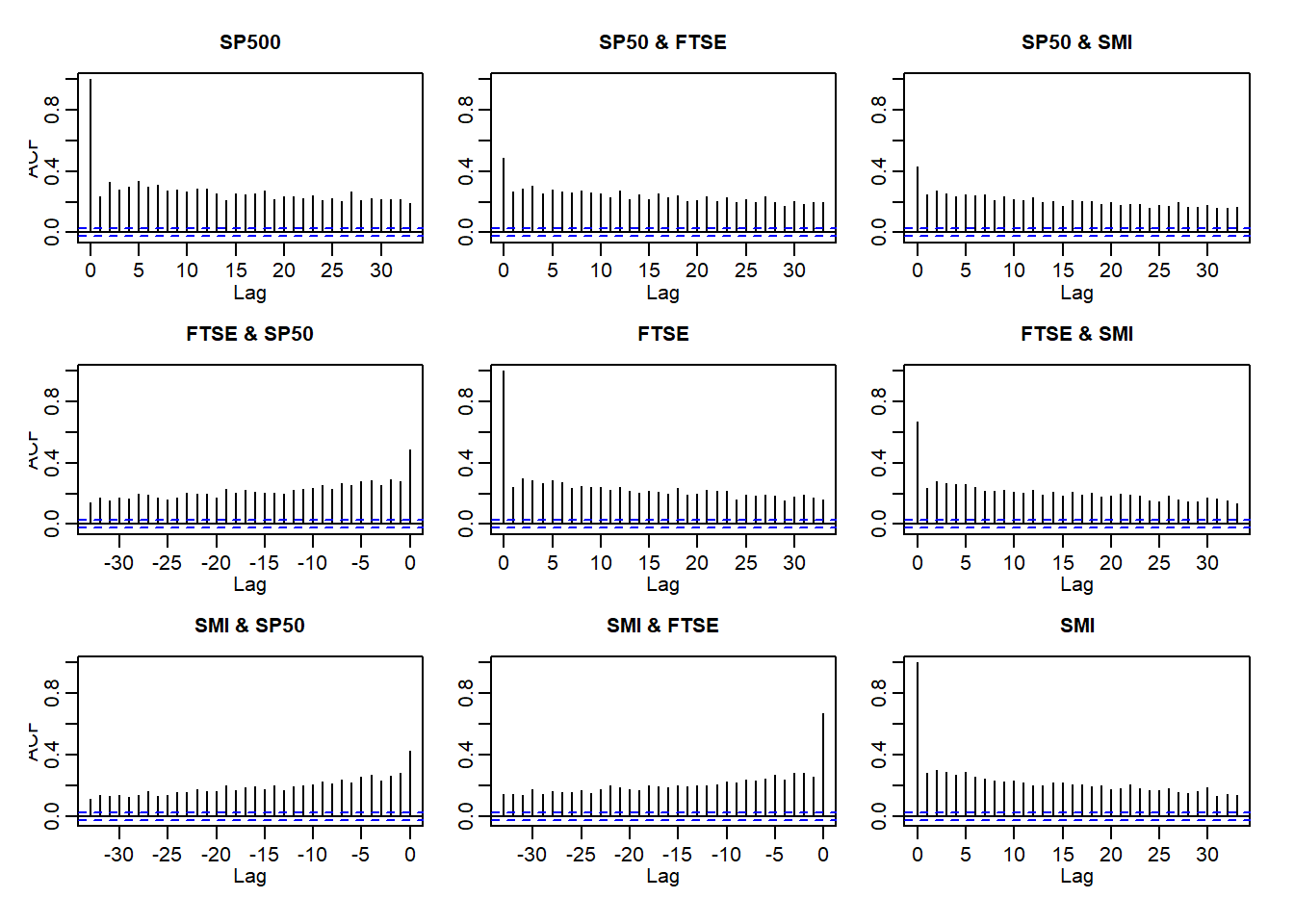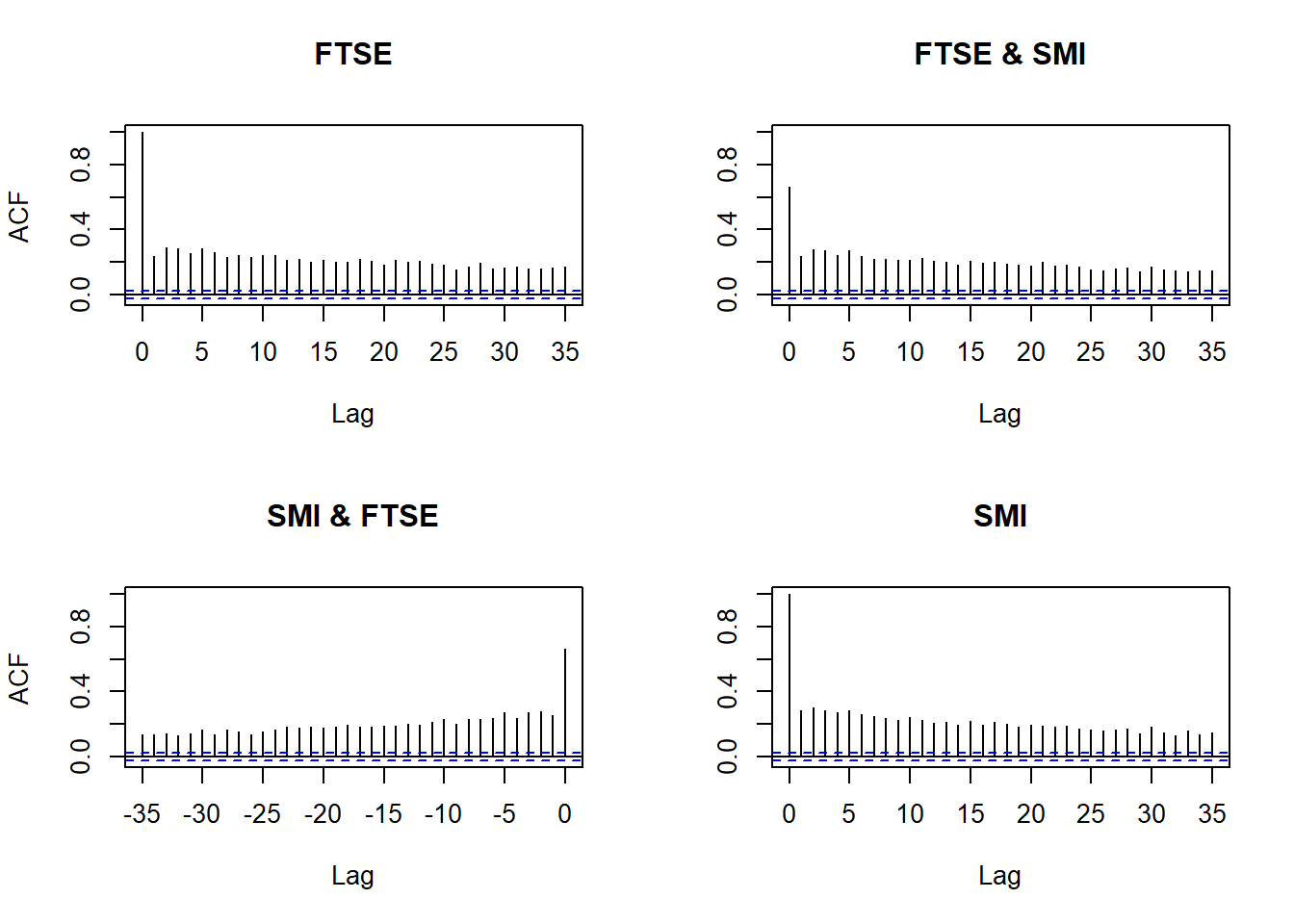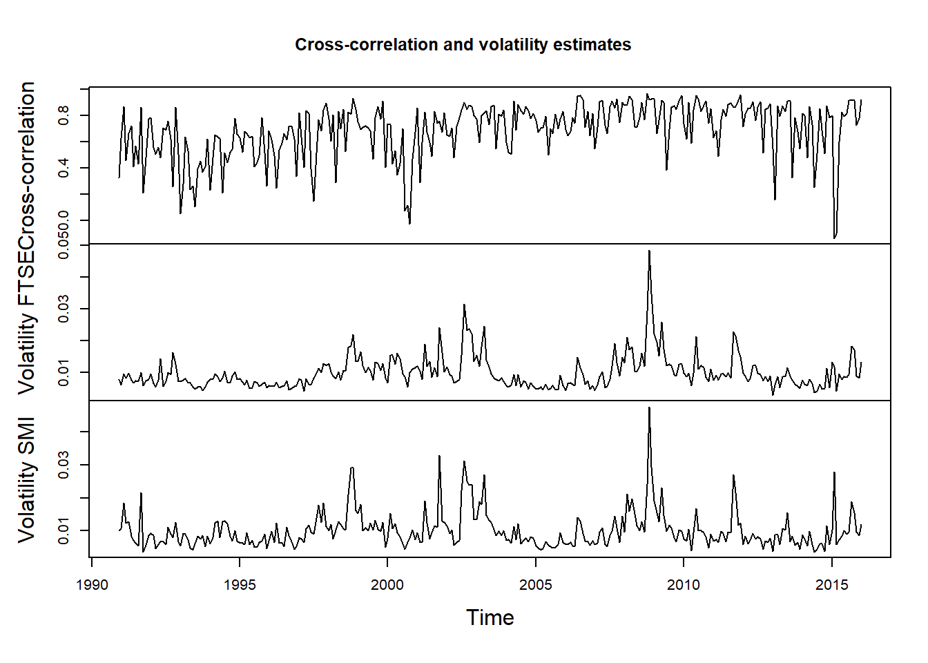 names(X.cor.vols) = c("Cross-correlation", "Volatility FTSE", "Volatility SMI")