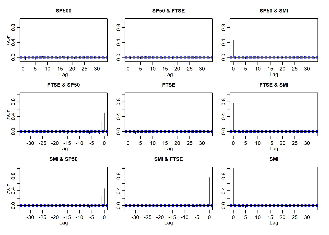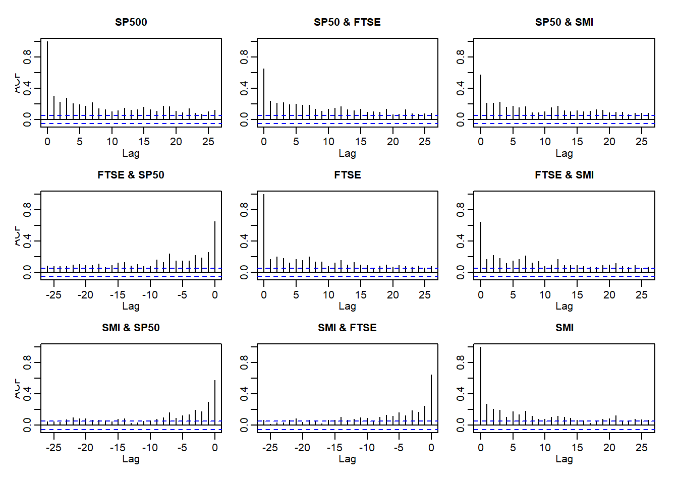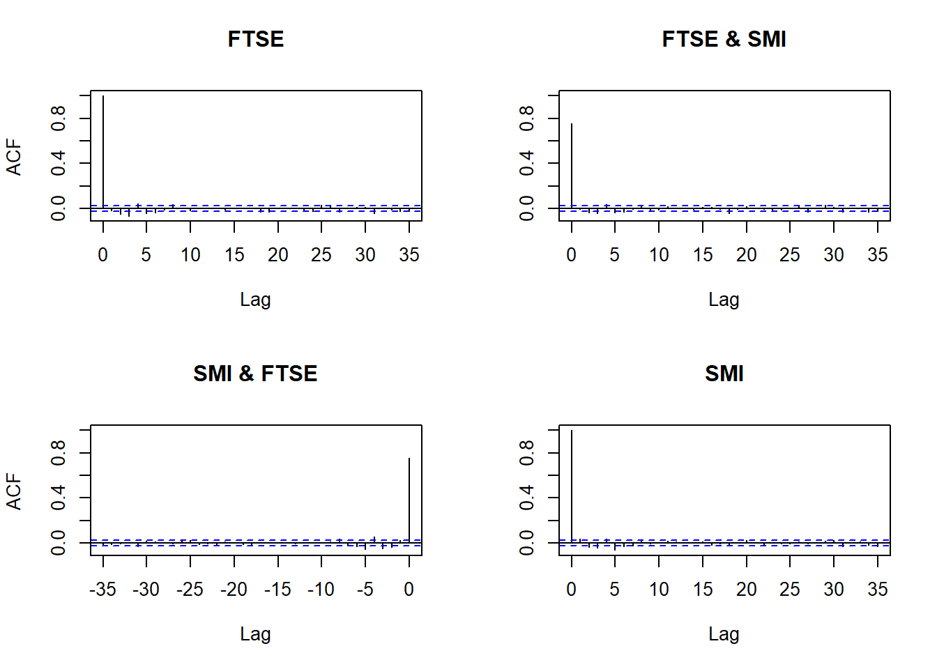names(X.cor.vols) = c("Cross-correlation", "Volatility FTSE", "Volatility SMI")