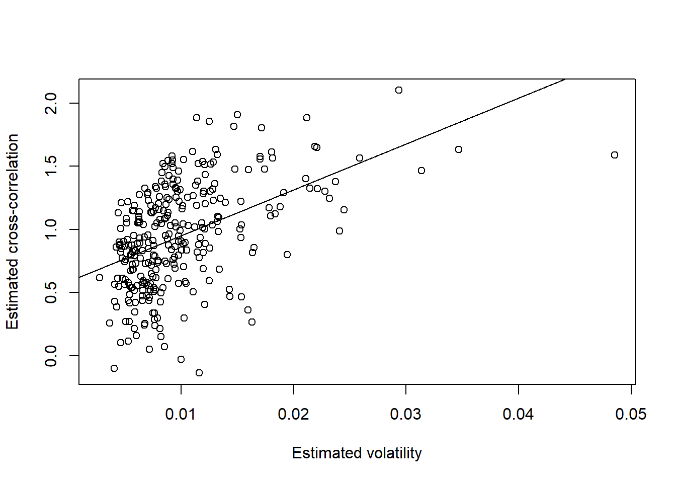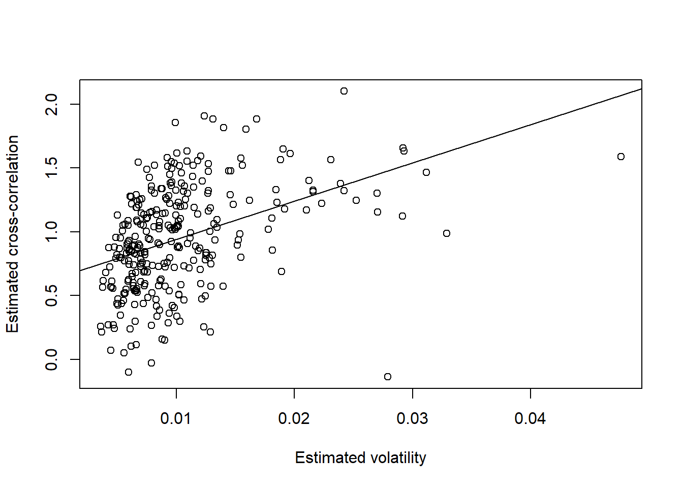## relationship between volatility and cross-correlationExtract volatilities and compute Fisher-transformed cross-correlations: