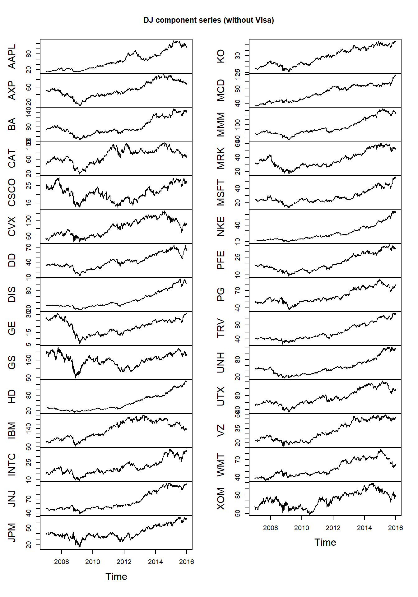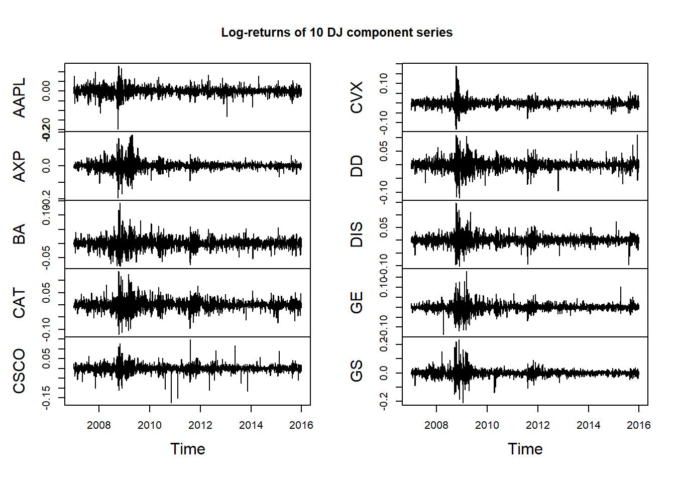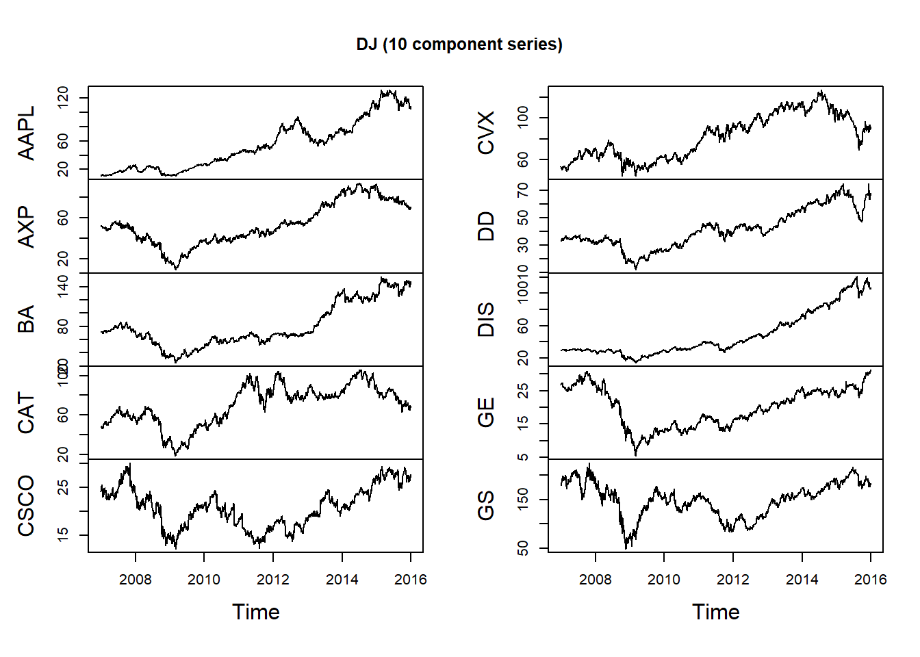 plot.zoo(DJdata, xlab = "Time", main = "DJ (10 component series)")