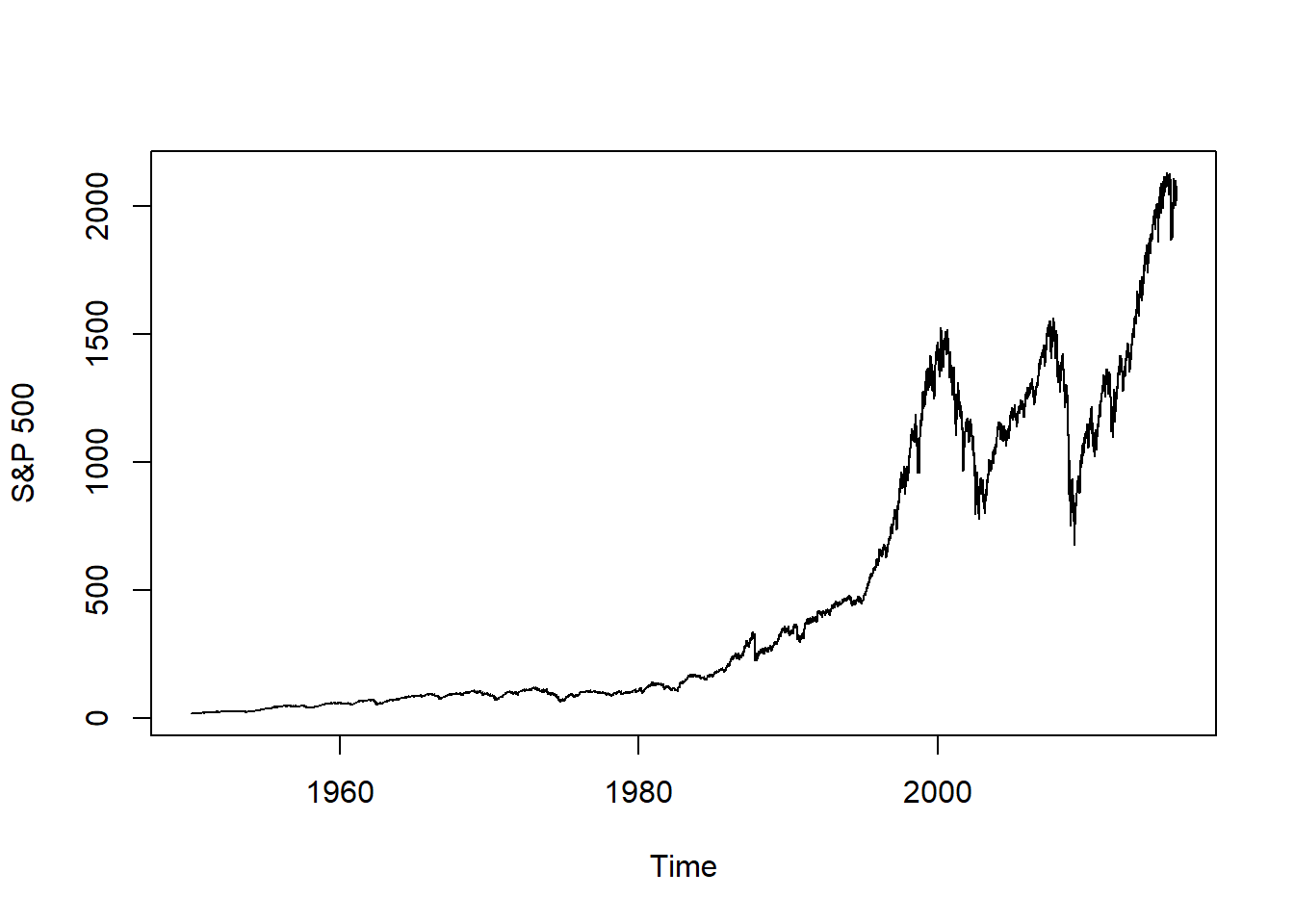 plot.zoo(SP500, xlab = "Time", ylab = "S&P 500")