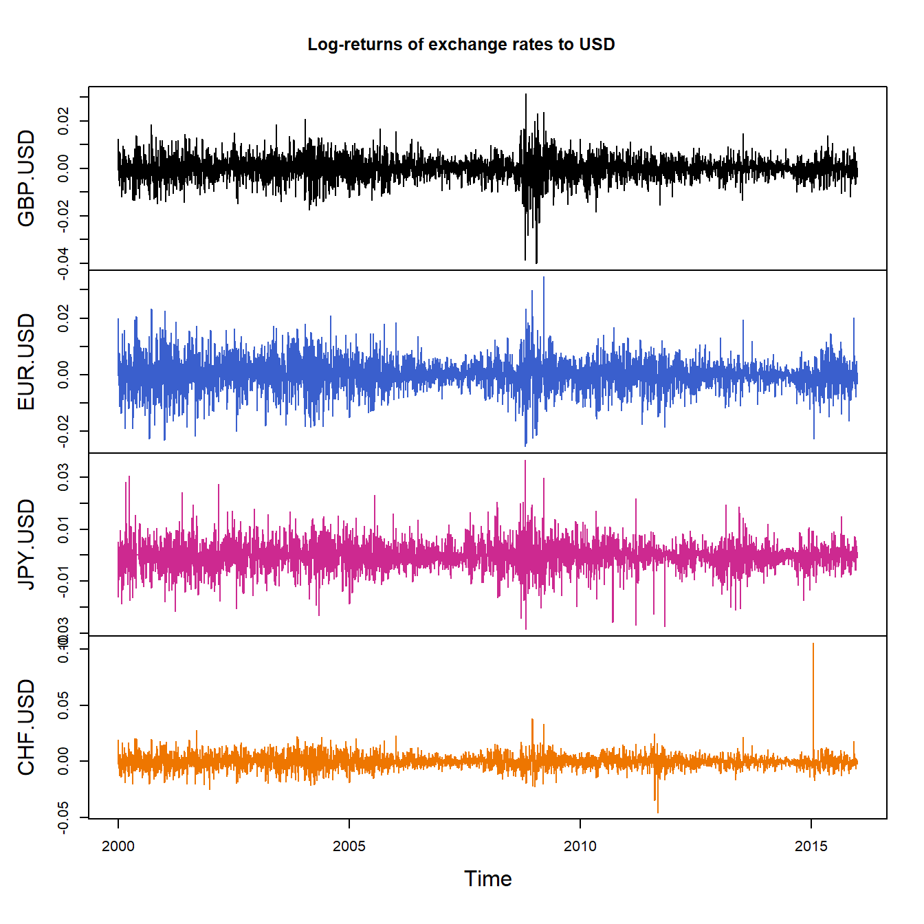 plot.zoo(X, xlab = "Time", main = "Log-returns") # seems like extremes occur together
