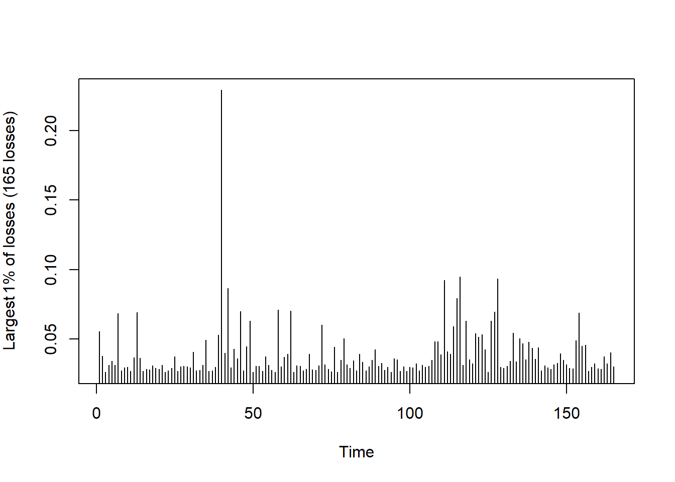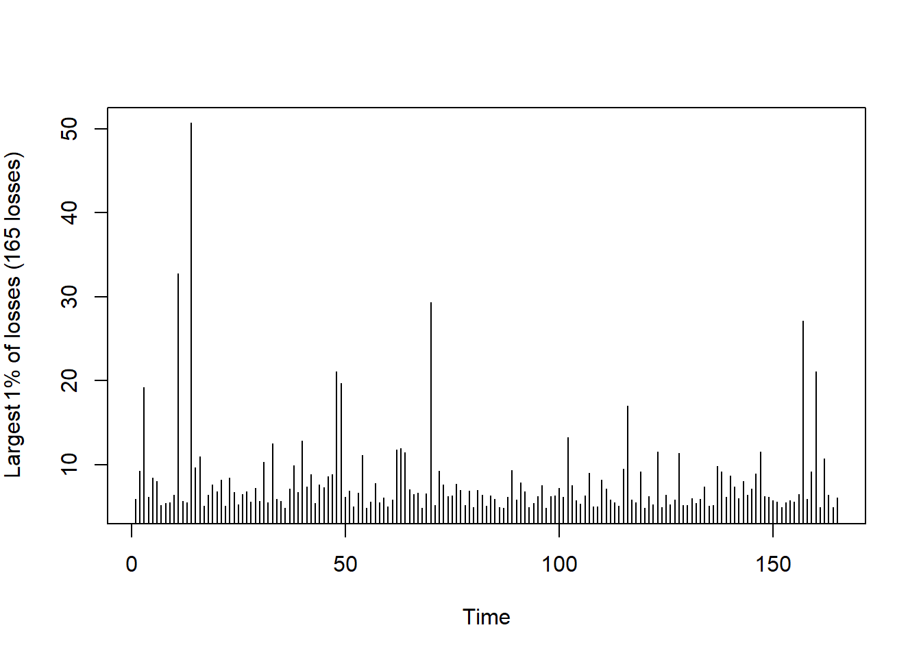library(qrmtools)we denote a return series by \(X_1,..., X_n\) and assume that the returns have been formed by logarithmic differencing of a price, index or exchange-rate series \((S_t)_{t=0,1,...,n}\), so \(X_t = \ln(S_t/S_{t−1}), \ t = 1,...,n\).