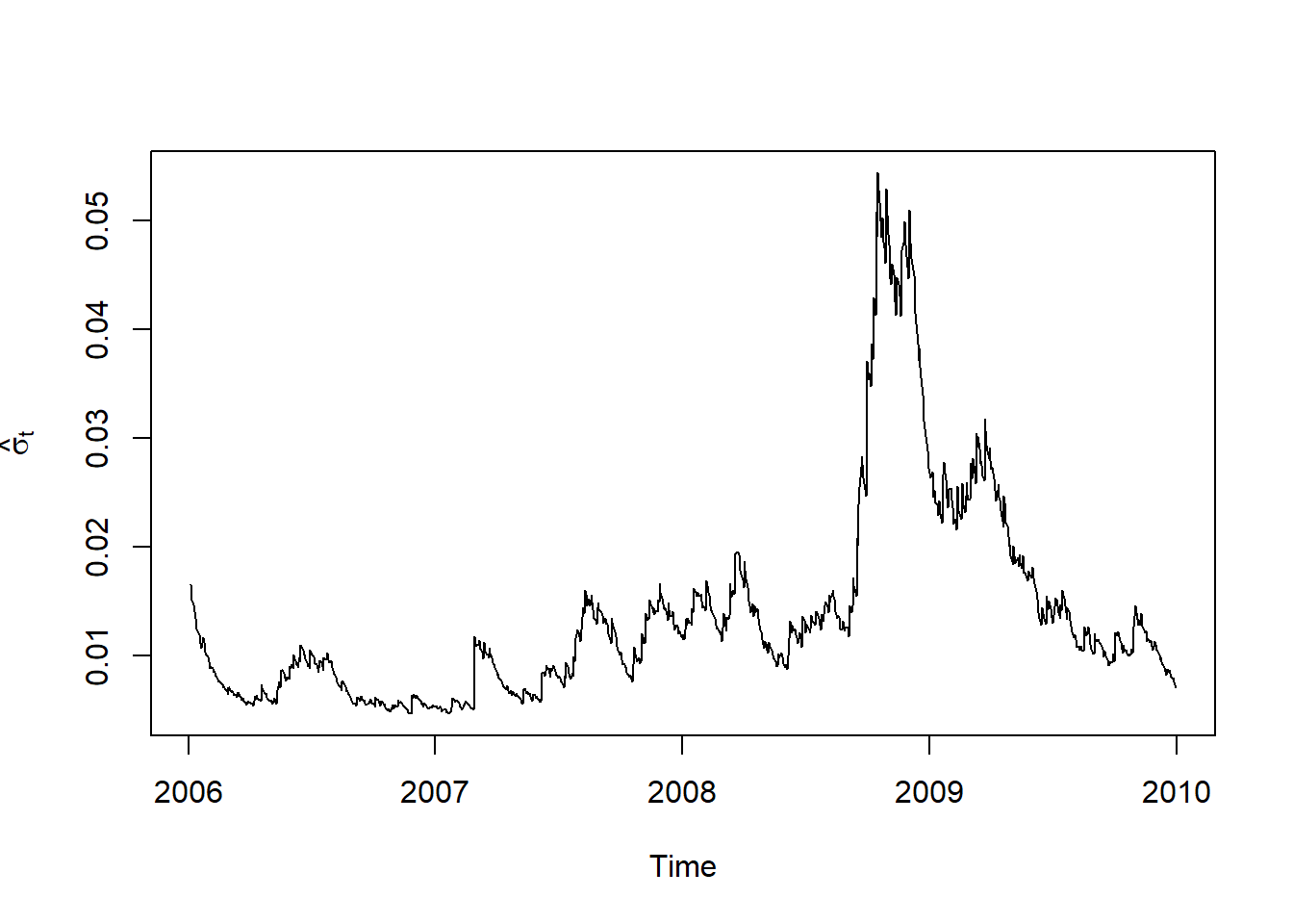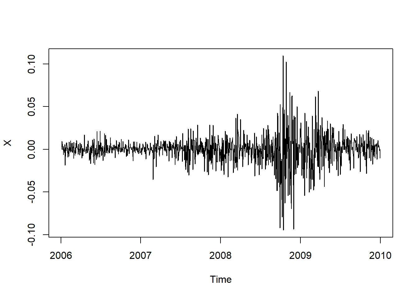 options(digits = 10)Exercise 4.1 (Fitting GARCH models to equity index return data) Take the set of closing prices of the S&P 500 index from 2006 to 2009 including the financial crisis; see the dataset SP500 of the R package qrmdata.