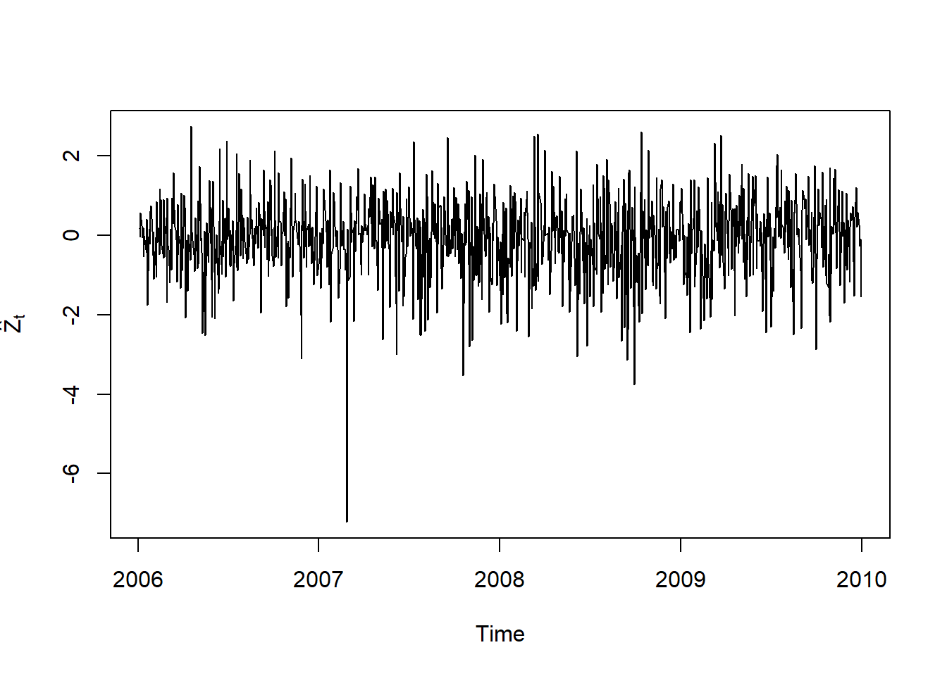 resi = as.numeric(residuals(fit, standardize = TRUE)) # standardized residuals (equivalent to fit@fit$z)