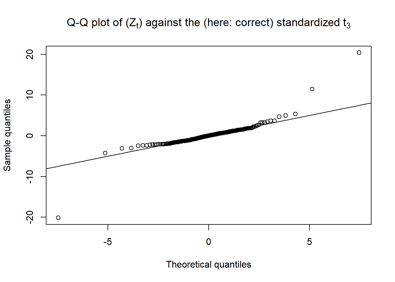 ugarchspec()andugarchfit()in the R packagerugarch. Plot the resulting standardized residuals and Q-Q plots against the fitted innovation distributions.Add \(\text{AR}(1)\), \(\text{MA}(1)\) and \(\text{ARMA}(1, 1)\) models for the conditional mean and investigate whether this improves the resulting fit of the models.