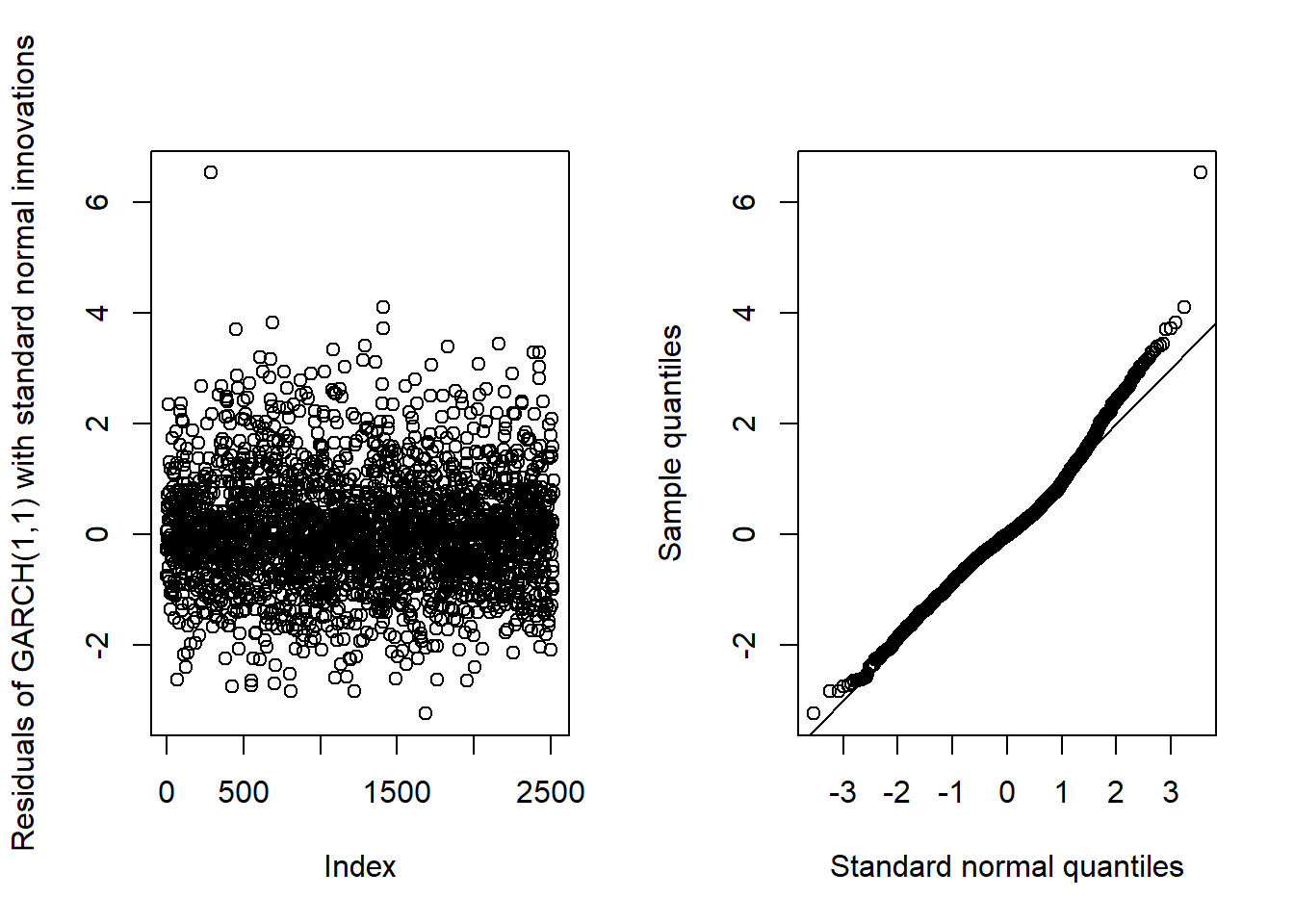 ## ARMA(1,1)-GARCH(1,1)GARCH11_check(X.d, armaOrder = c(1, 1), distribution.model = "norm") # standard normal innovations