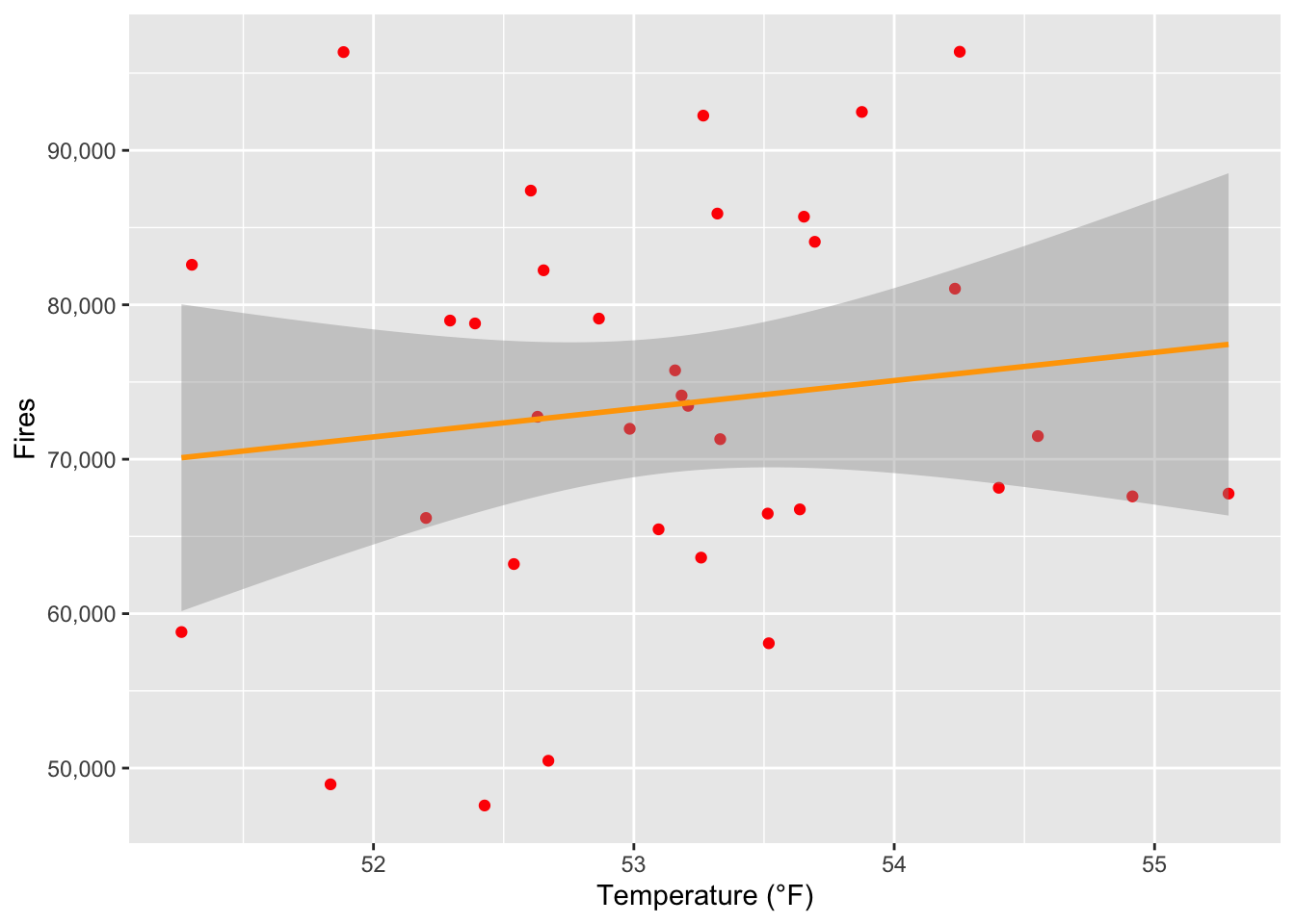 Next we have our graph plotting the number of fires per year against the average temperature from each year. There is a slight linear correlation between the two, and as shown by the graph an increase of a mere 3 degrees Farenheit would cause around 6,000 more fires per year on average, which is no small amount.