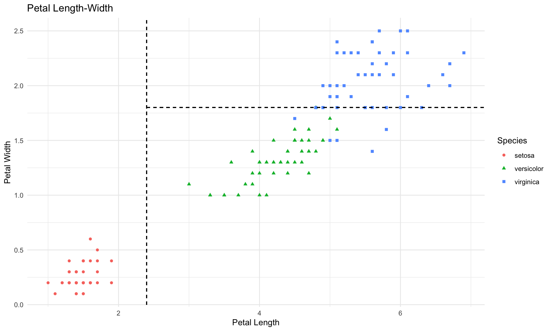 Interestingly, the classification tree above decided to split the data based on petal length and width only. Thesee split points are represented by the dashed lines: