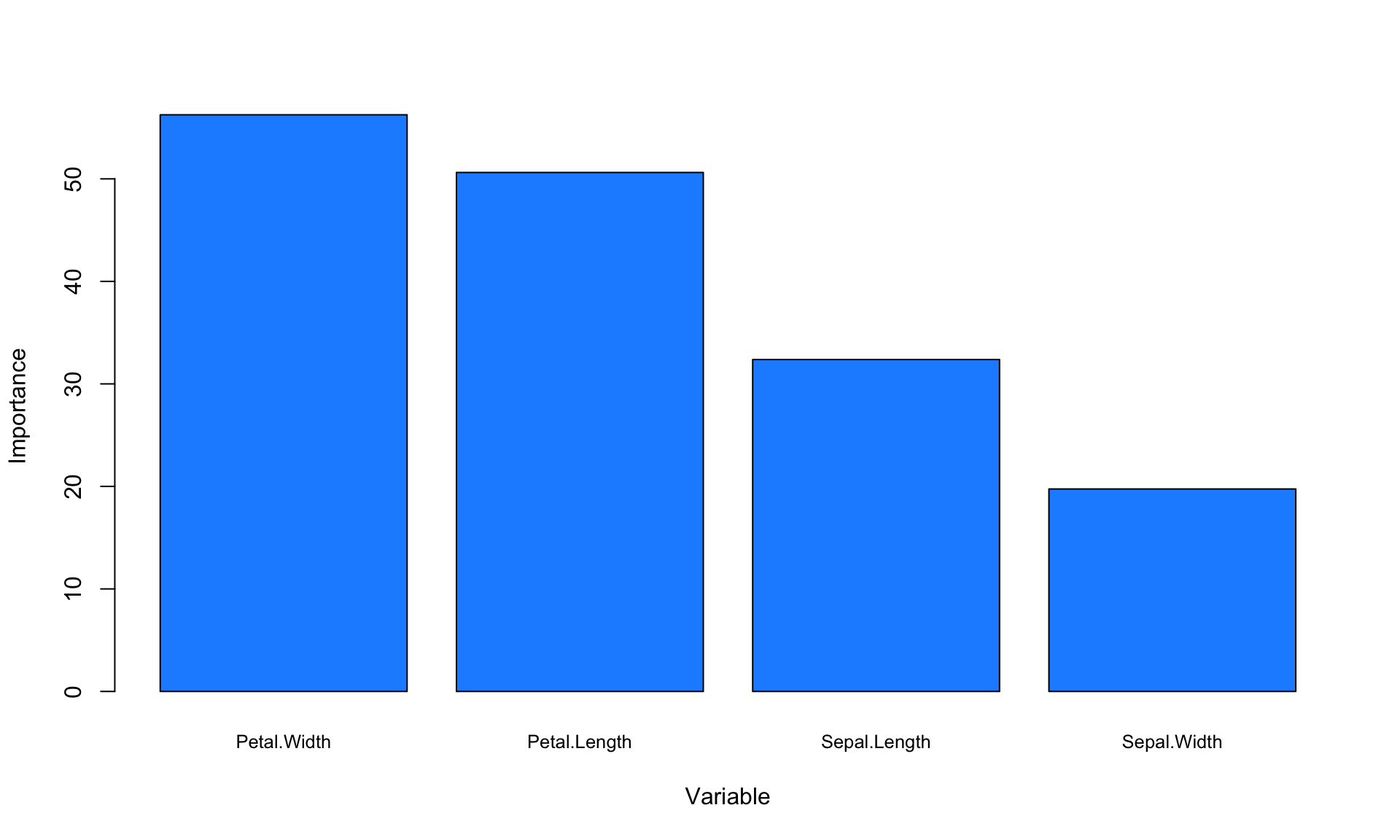 The variable importance values do not have a straightforward interpretation, so what really matters here are the relative values. The plot above suggests that petal dimensions are more important than sepal dimensions, at least for our specific goal of predicting flower species.