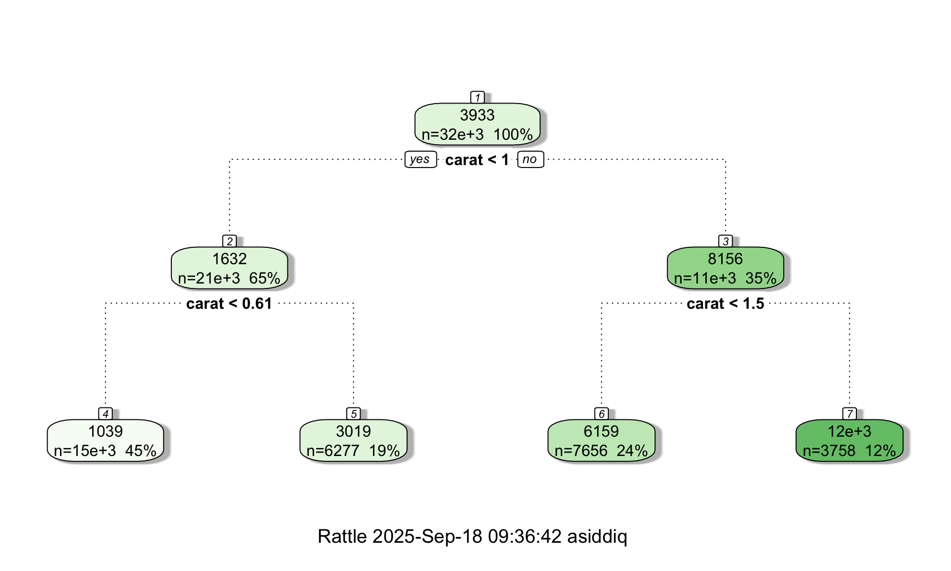 In a regression tree, each leaf of the tree diagram contains a single number which is the predicted price of all diamonds that “land” in that leaf. As before, the tree diagram also shows the number of data points contained in each leaf. Interestingly, the tree diagram splits twice on the carat variable, suggesting that the number of carats is an important variable with respect to predicting the price.