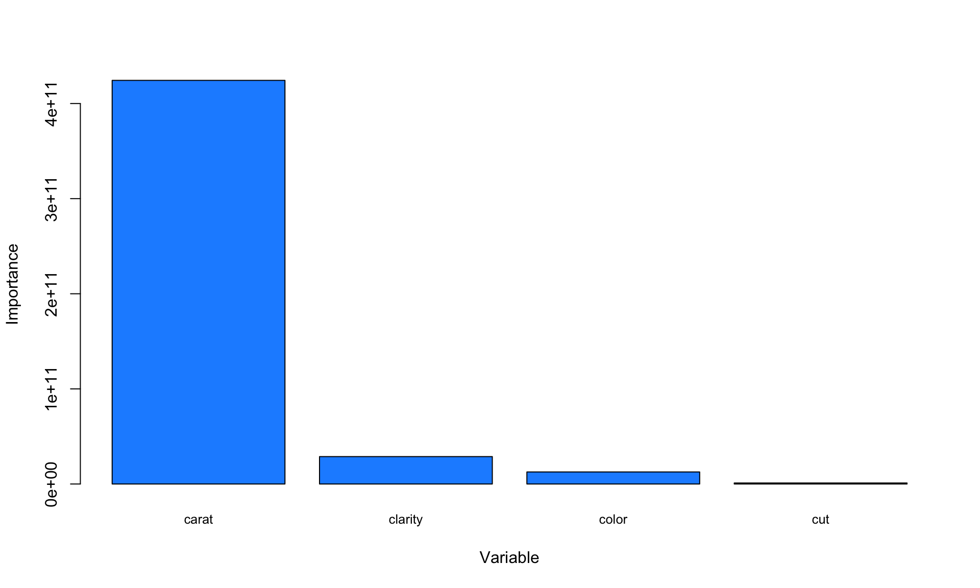 The variable importance plot above suggests that carat is clearly the most important variable with respect to predicting the price of a diamond.
