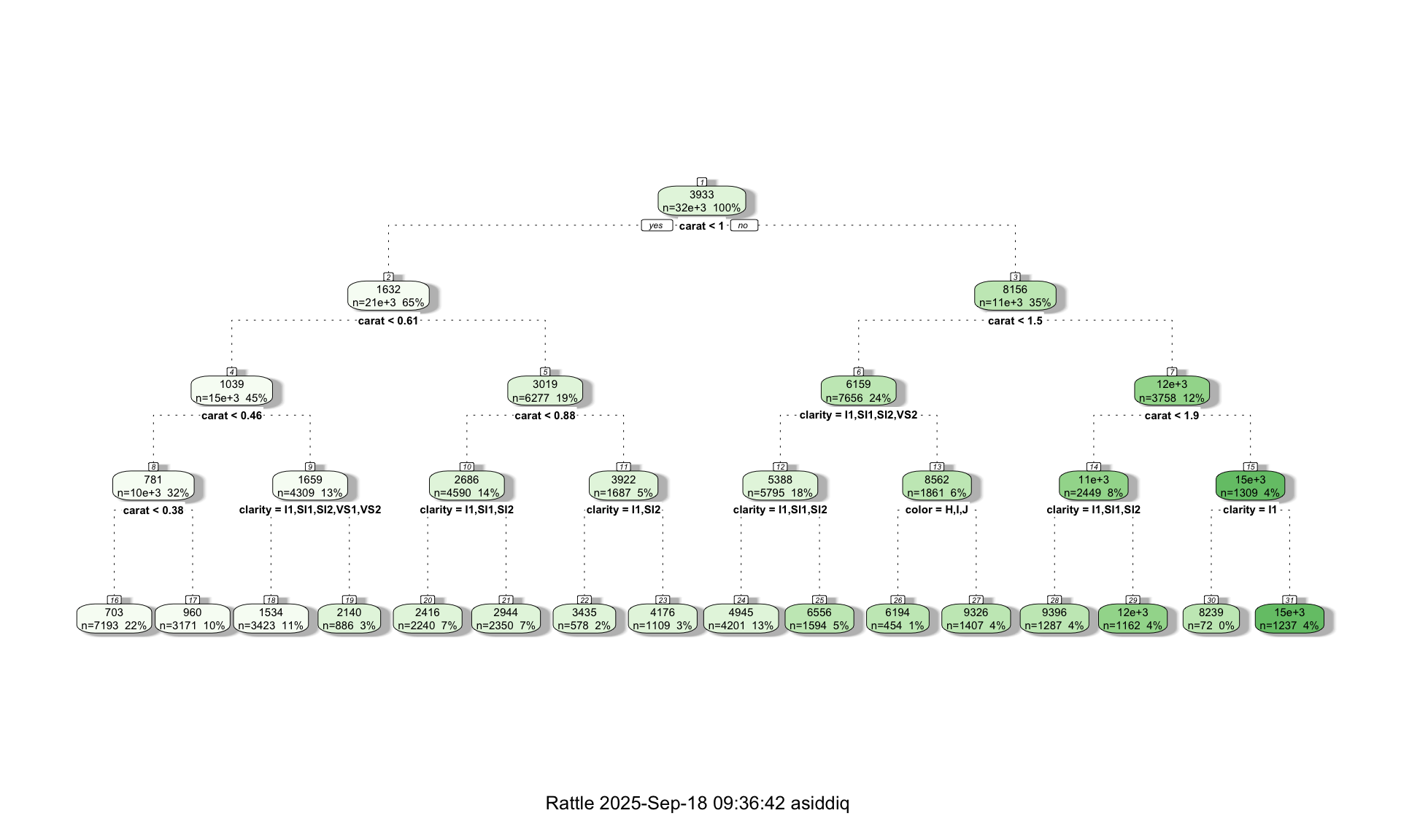 tree <- rpart(price ~ carat + cut + color + clarity, data=train, method="anova",maxdepth=4, cp = 0)