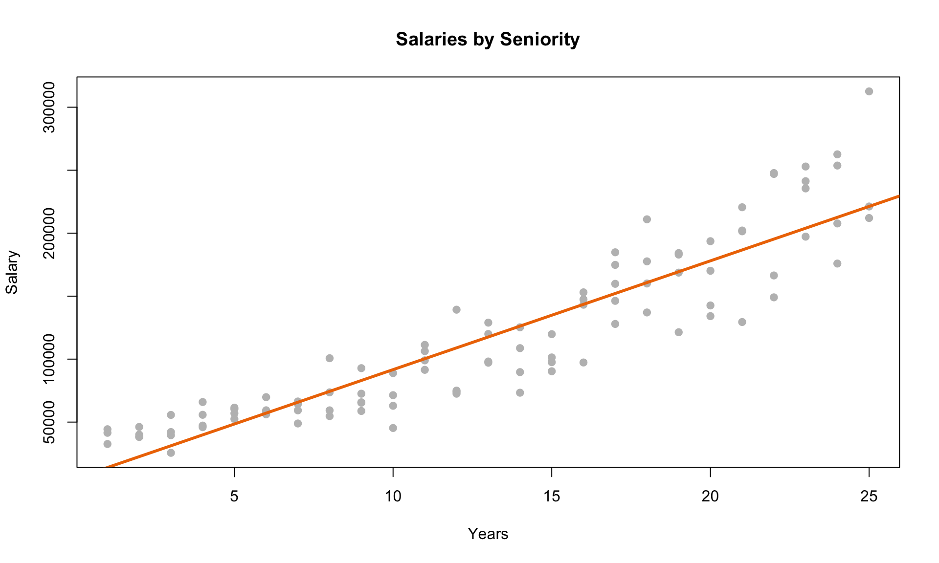 Suppose you are offered a job at a (fictional) company, and want to know whether the salary offered is comparable to current employees. Luckily, you were able to get your hands on anonymized salary data from the company. The data contains the salary of 100 employees and their years of experience: