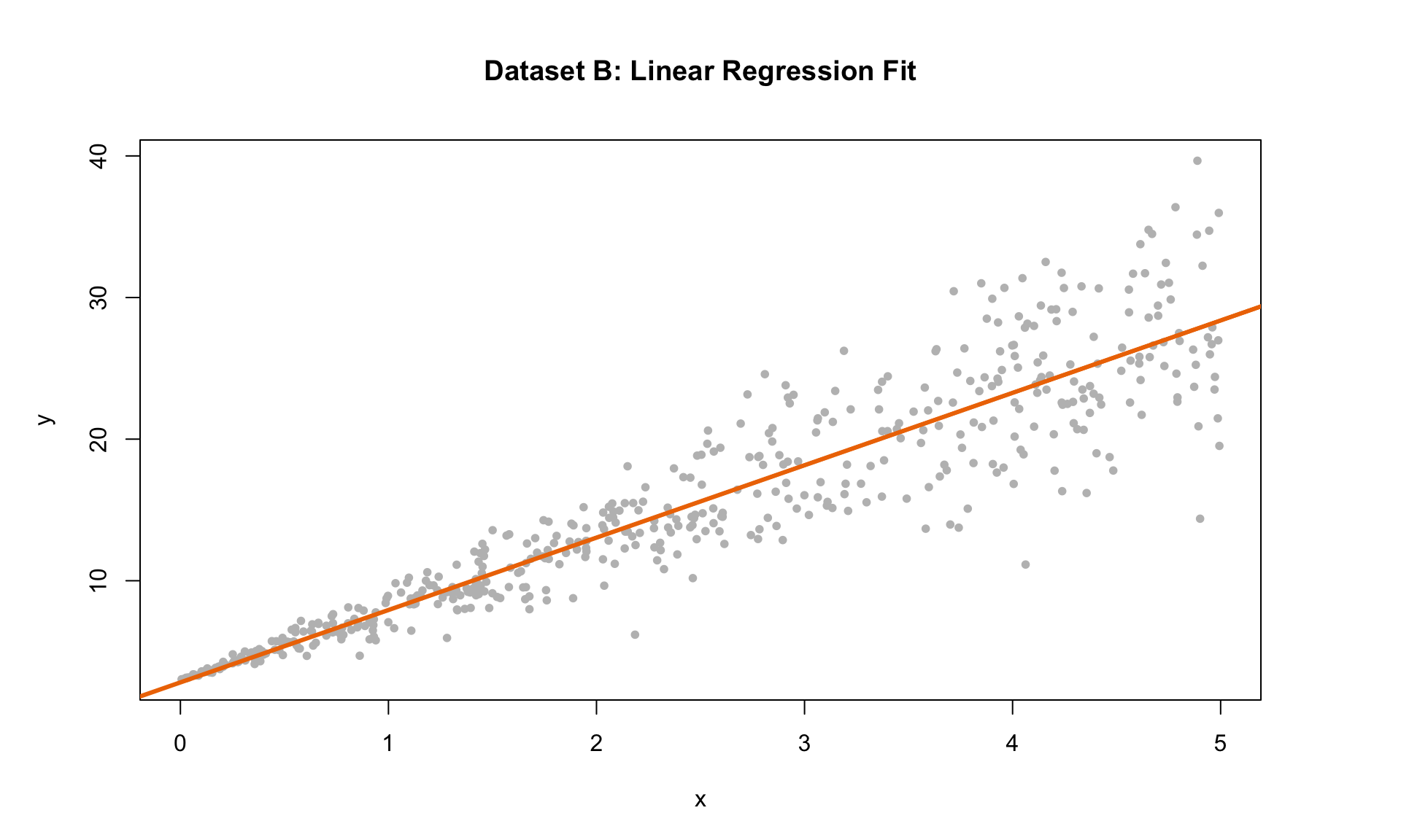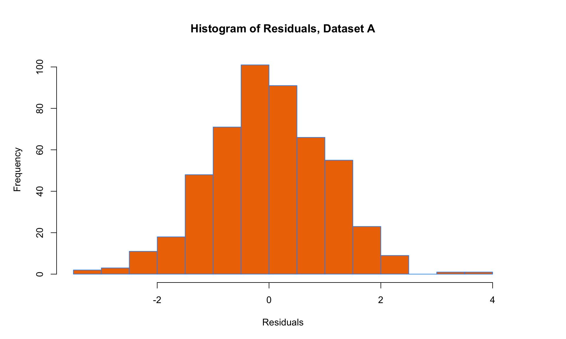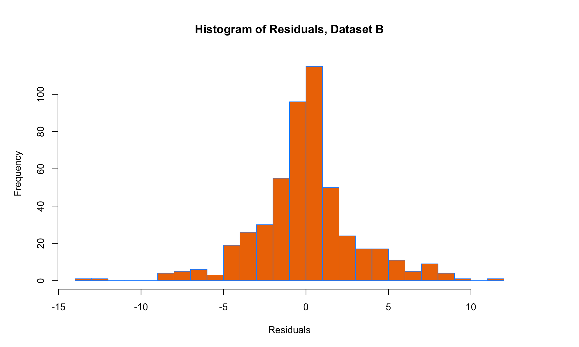 Based on the diagnostic plot criteria outlined above, we can see that conditions L, I and N are mostly satisfied (although, one might argue that the histogram of residuals is not Normal, so this one is a borderline case). In any case, condition E is clearly not satisfied, because the residuals tend to spread out (i.e., have higher variance) for larger values along the x-axis of the scatter plot. So we should be skeptical of the results of a linear regression analysis on this dataset.