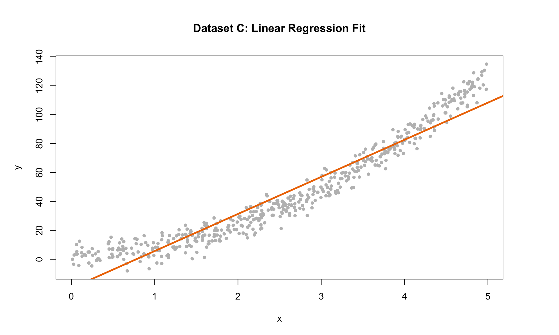 In summary, linear regression is an extremely powerful tool, but the slope estimates and predictions may be inaccurate if the data violates one of the LINE conditions. Diagnostic plots can be helpful in determining whether linear regression is the right tool for the job. In some cases, a non-linear relationship in the data can be converted into a linear one using a logarithmic transformation – a very useful trick for applying linear regression to non-linear relationships.