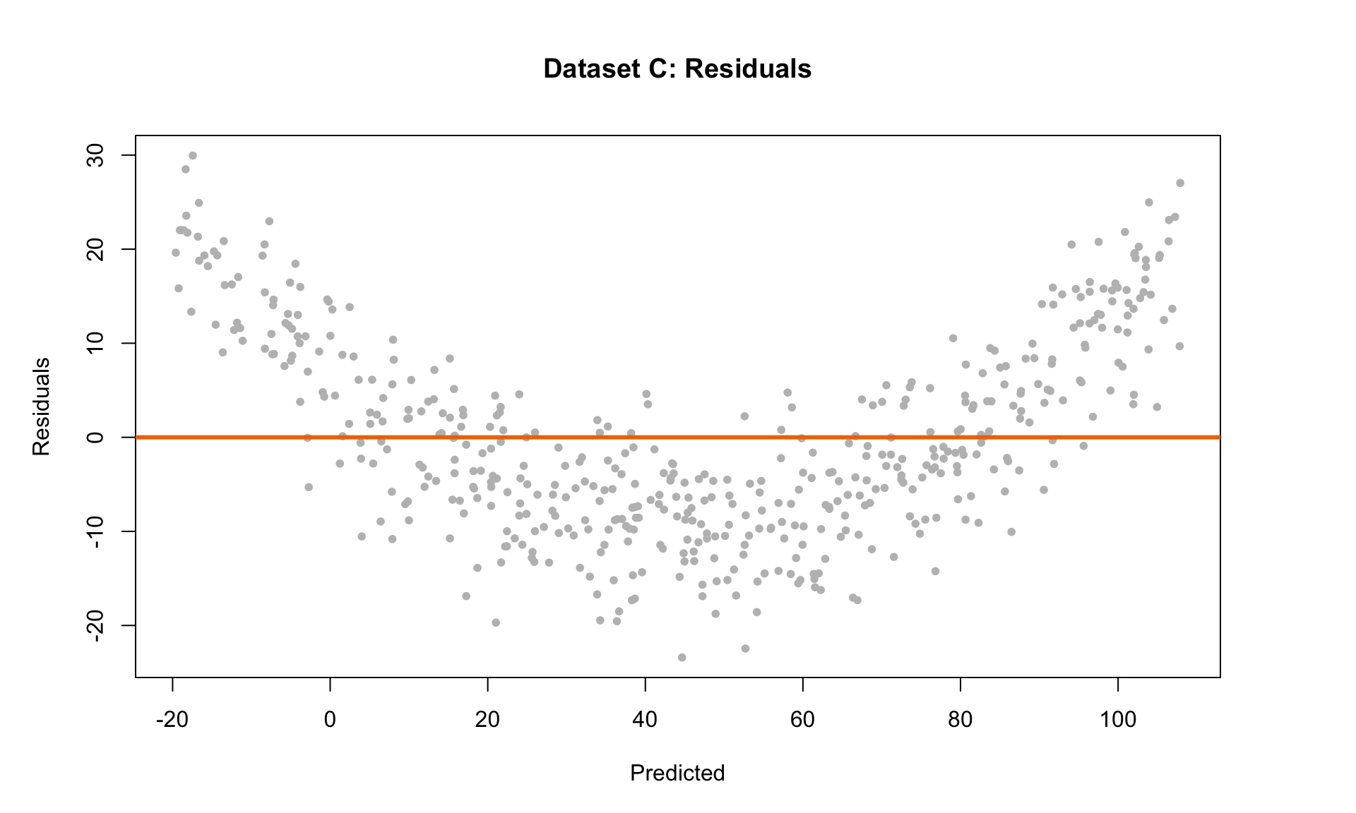 Here, we can see that the variance of the residuals is approximately the same everywhere, so the E condition is satisfied. But all three of the other conditions are violated! The mean is not zero at each point along the x-axis (condition L violated), and there is an obvious trend in the residual scatterplot (condition I violated). The histogram of residuals is also skewed and not Normal (condition N violated). Linear regression is clearly not suitable for this data set.